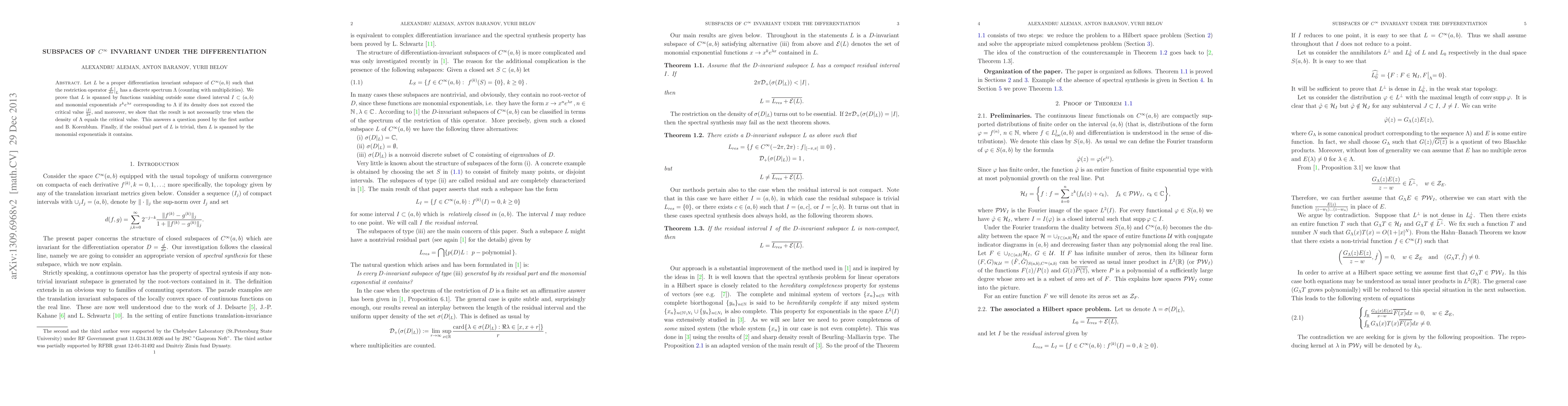 Let $L$ be a proper differentiation invariant subspace of $C^\infty(a,b)$ such that the restriction operator $\frac{d}{dx}\bigl{|}_L$ has a discrete spectrum $\Lambda$ (counting with multiplicities). We prove that $L$ is spanned by functions vanishing outside some closed interval $I\subset(a,b)$ and monomial exponentials $x^ke^{\lambda x}$ corresponding to $\Lambda$ if its density does not exceed the critical value $\frac{|I|}{2\pi}$, and moreover, we show that the result is not necessarily true when the density of $\Lambda$ equals the critical value. This answers a question posed by the first author and B. Korenblum. Finally, if the residual part of $L$ is trivial, then $L$ is spanned by the monomial exponentials it contains.