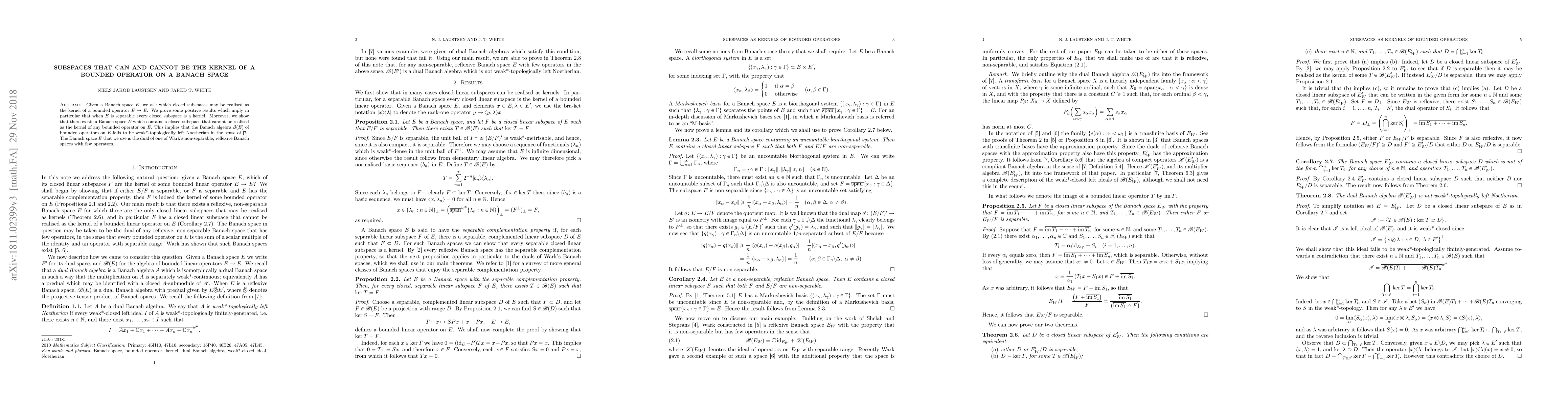 Given a Banach space $E$, we ask which closed subspaces may be realised as the kernel of a bounded operator $E \rightarrow E$. We prove some positive results which imply in particular that when $E$ is separable every closed subspace is a kernel. Moreover, we show that there exists a Banach space $E$ which contains a closed subspace that cannot be realized as the kernel of any bounded operator on $E$. This implies that the Banach algebra $\mathcal{B}(E)$ of bounded operators on $E$ fails to be weak*-topologically left Noetherian. The Banach space $E$ that we use is the dual of Wark's non-separable, reflexive Banach space with few operators.