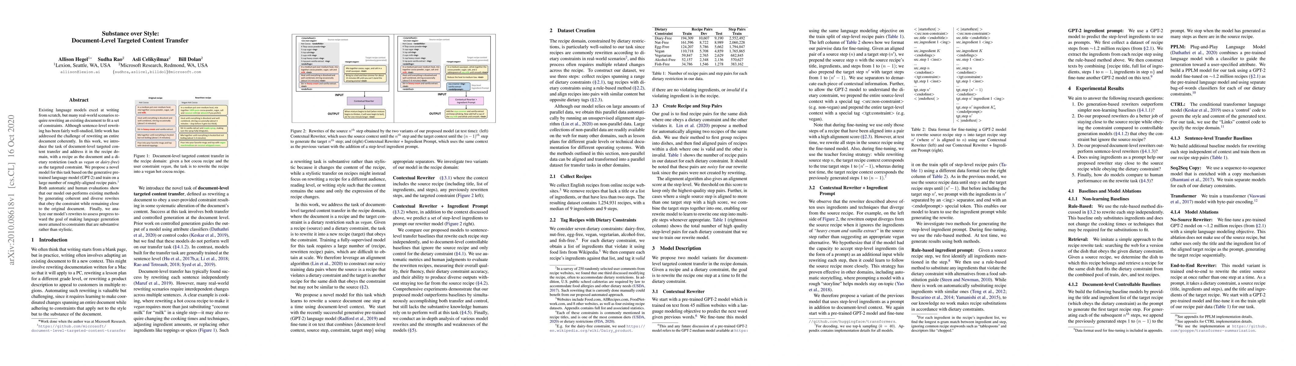 The model, based on the GPT-2 language model, achieves this by generating rewrites that remain close to the original document while obeying constraints like dietary restrictions.