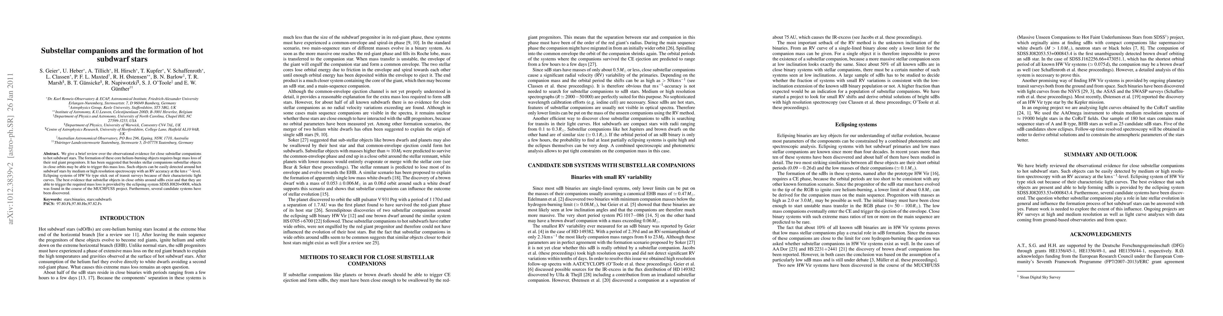 The paper presents a comprehensive review of observational evidence for substellar companions to hot subdwarf stars, highlighting detection methods and candidate systems.