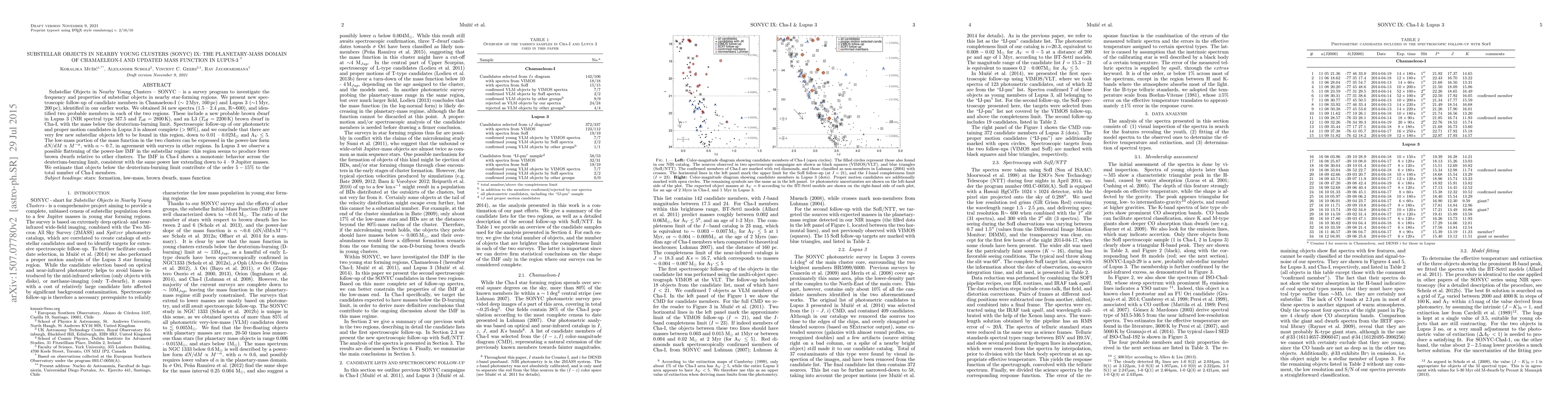 Substellar Objects in Nearby Young Clusters -- SONYC -- is a survey program to investigate the frequency and properties of substellar objects in nearby star-forming regions. We present new spectroscopic follow-up of candidate members in Chamaeleon-I (~2 Myr, 160 pc) and Lupus 3 (~1 Myr, 200 pc), identified in our earlier works. We obtained 34 new spectra (1.5 - 2.4 mum, R~600), and identified two probable members in each of the two regions. These include a new probable brown dwarf in Lupus 3 (NIR spectral type M7.5 and Teff=2800 K), and an L3 (Teff=2200 K) brown dwarf in Cha-I, with the mass below the deuterium-burning limit. Spectroscopic follow-up of our photometric and proper motion candidates in Lupus 3 is almost complete (>90%), and we conclude that there are very few new substellar objects left to be found in this region, down to 0.01 - 0.02 MSun and Av \leq 5. The low-mass portion of the mass function in the two clusters can be expressed in the power-law form dN/dM \propto M^{-\alpha}, with \alpha~0.7, in agreement with surveys in other regions. In Lupus 3 we observe a possible flattening of the power-law IMF in the substellar regime: this region seems to produce fewer brown dwarfs relative to other clusters. The IMF in Cha-I shows a monotonic behavior across the deuterium-burning limit, consistent with the same power law extending down to 4 - 9 Jupiter masses. We estimate that objects below the deuterium-burning limit contribute of the order 5 - 15% to the total number of Cha-I members.