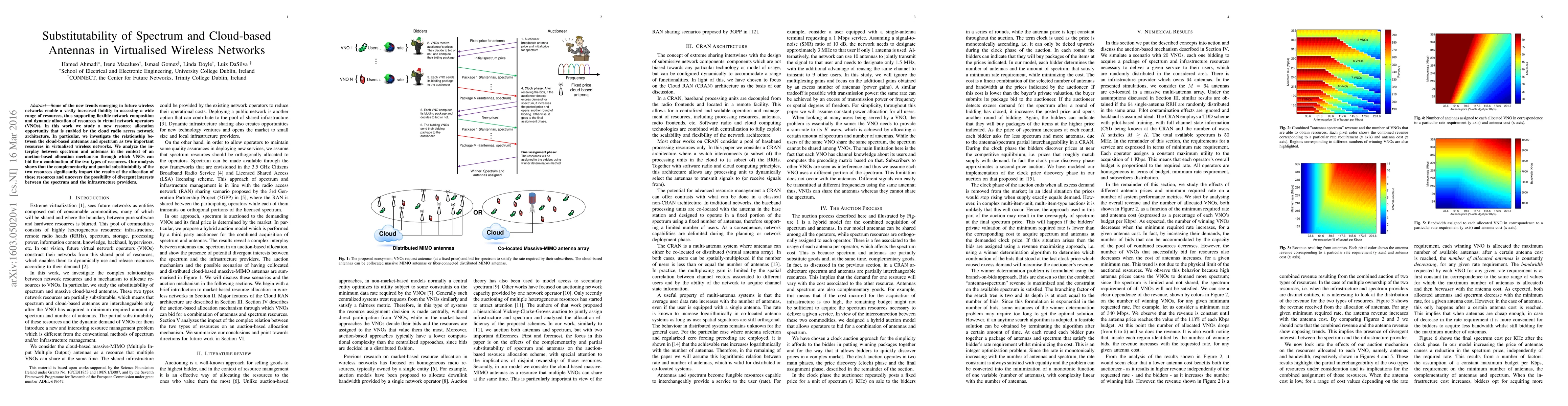 This paper explores the relationship between cloud-based antennas and spectrum in virtualized wireless networks, focusing on their substitutability. It analyzes how these resources interact within an auction-based allocation mechanism, revealing their complementarity and partial substitutability, and highlighting potential conflicts between spectrum and infrastructure providers.