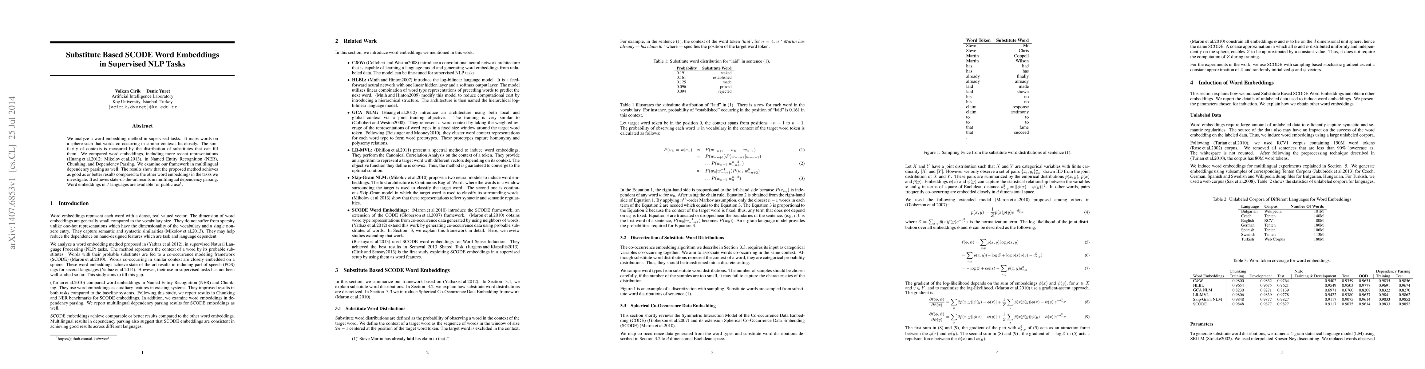 This paper proposes a novel word embedding method based on substitute context overlap, showing competitive performance in supervised NLP tasks like Named Entity Recognition, Chunking, and Dependency Parsing. The method achieves state-of-the-art results in multilingual dependency parsing and provides embeddings for seven languages.