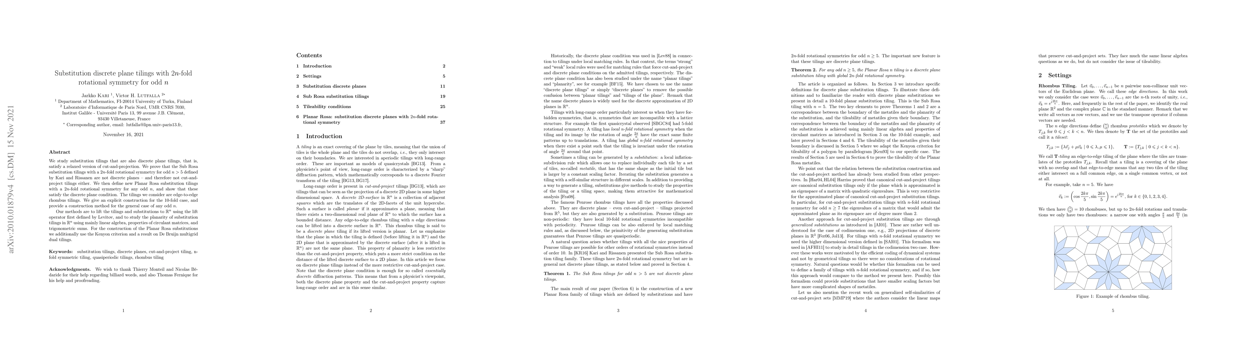 The paper uses substitution tiling theory, focusing on edge-to-edge rhombus tilings with 2n-fold rotational symmetry for odd n. It proves non-discreteness of certain tilings and constructs new tilings that satisfy the discrete plane condition.