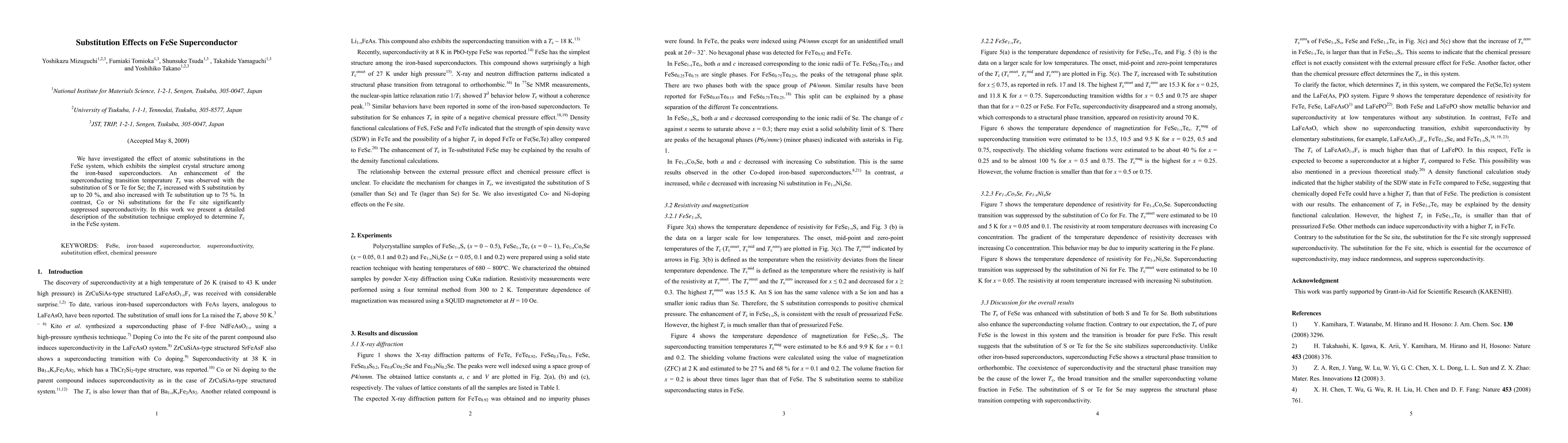 This study investigates atomic substitutions in FeSe, finding that S or Te substitution for Se enhances the superconducting transition temperature Tc by up to 20% and 75% respectively, while Co or Ni substitution for Fe significantly suppresses superconductivity. The research details the substitution technique used to measure Tc.