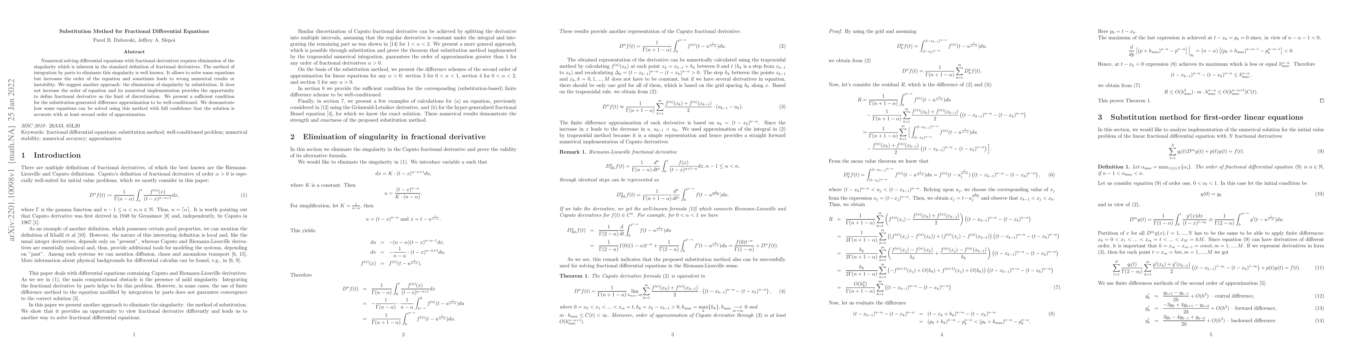 Numerical solving differential equations with fractional derivatives requires elimination of the singularity which is inherent in the standard definition of fractional derivatives. The method of integration by parts to eliminate this singularity is well known. It allows to solve some equations but increases the order of the equation and sometimes leads to wrong numerical results or instability. We suggest another approach: the elimination of singularity by substitution. It does not increase the order of equation and its numerical implementation provides the opportunity to define fractional derivative as the limit of discretization. We present a sufficient condition for the substitution-generated difference approximation to be well-conditioned. We demonstrate how some equations can be solved using this method with full confidence that the solution is accurate with at least second order of approximation.
