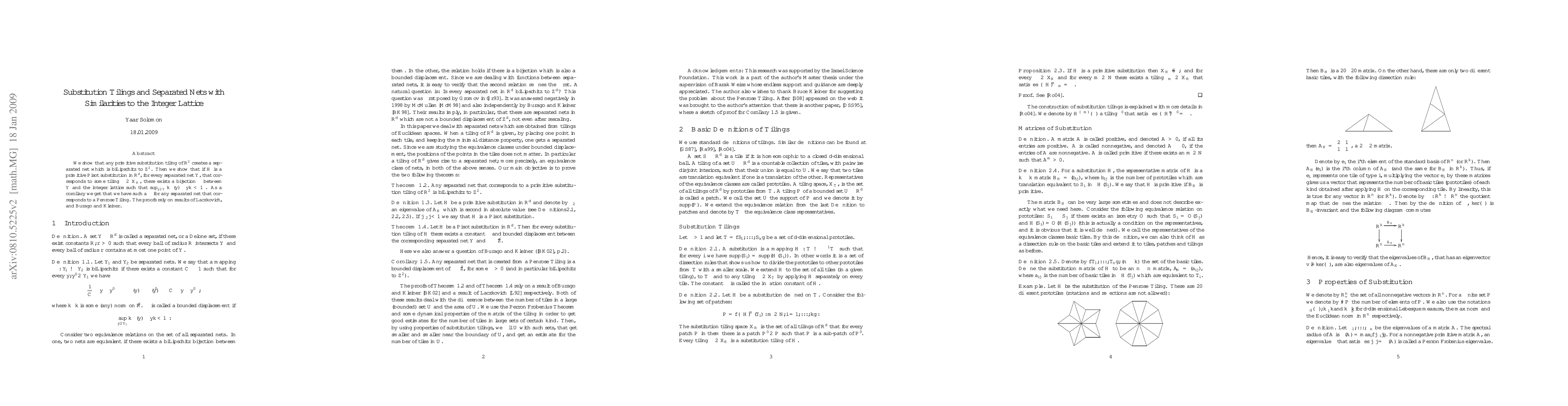 This paper demonstrates that primitive substitution tilings of the plane generate separated nets biLipschitz to the integer lattice. It further proves that for primitive Pisot substitutions, there exists a bounded distance translation bijection between any corresponding separated net and the integer lattice, extending this result to Penrose tilings. The proofs utilize results from Laczkovich and Burago-Kleiner.