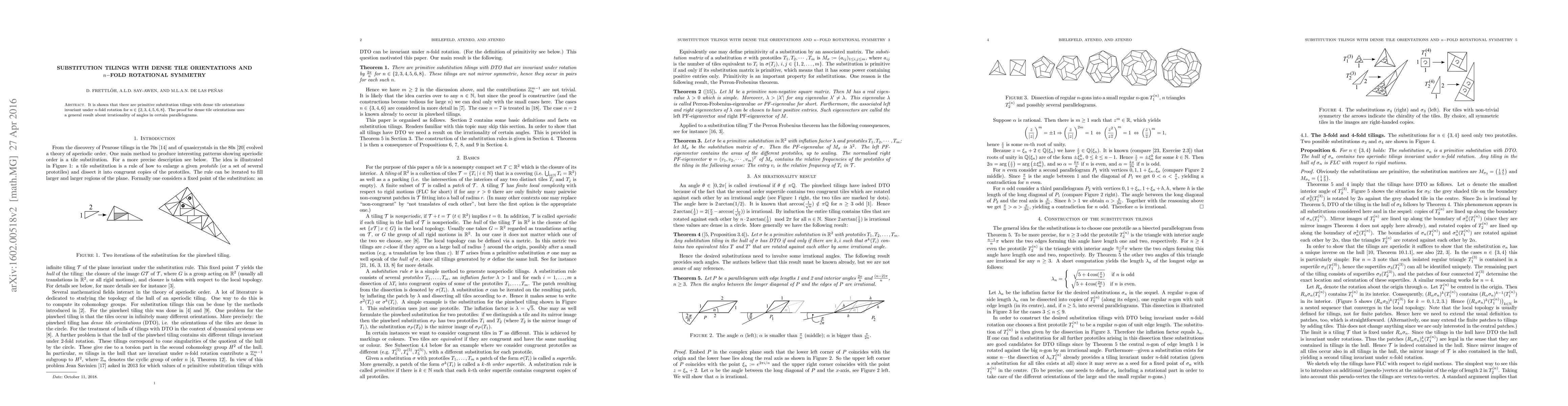 Summary: The paper demonstrates the existence of primitive substitution tilings that exhibit dense tile orientations invariant under n-fold rotational symmetry for n=2,3,4,5,6,8, using a proof based on the irrationality of angles in specific parallelograms. This work highlights the intricate relationship between substitution tilings and rotational symmetries.