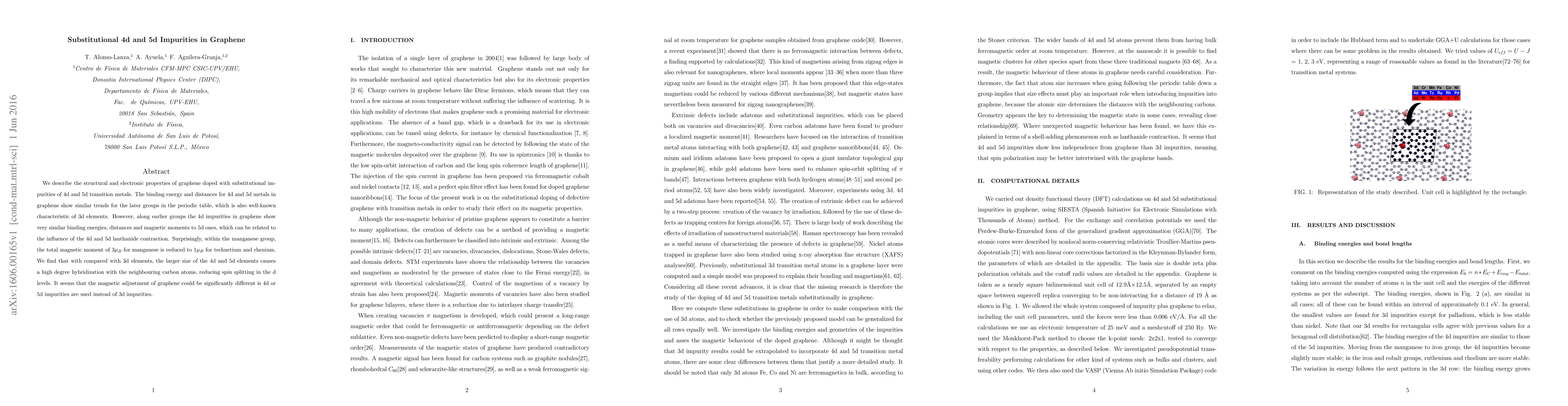 This paper examines the structural and electronic properties of graphene doped with 4d and 5d transition metal impurities, revealing that 4d and 5d impurities exhibit similar binding behaviors but differ from 3d elements due to larger size and hybridization effects, significantly altering graphene's magnetic properties.