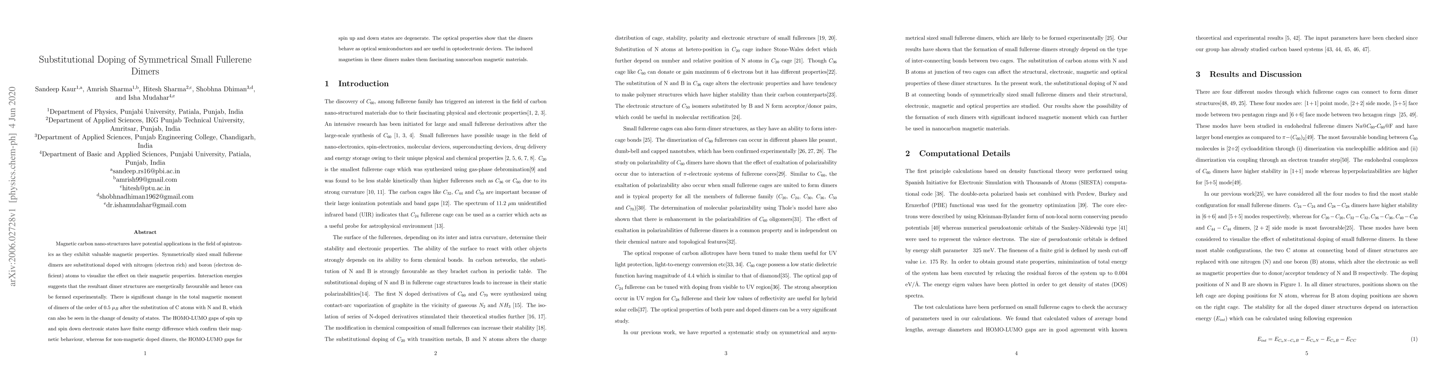 This research demonstrates that substituting nitrogen and boron for carbon in symmetrical small fullerene dimers results in energetically favorable structures with significant changes in magnetic moments, confirming their magnetic behavior. The dimers also exhibit optical semiconductor properties, making them promising for use in optoelectronic devices and spintronics.