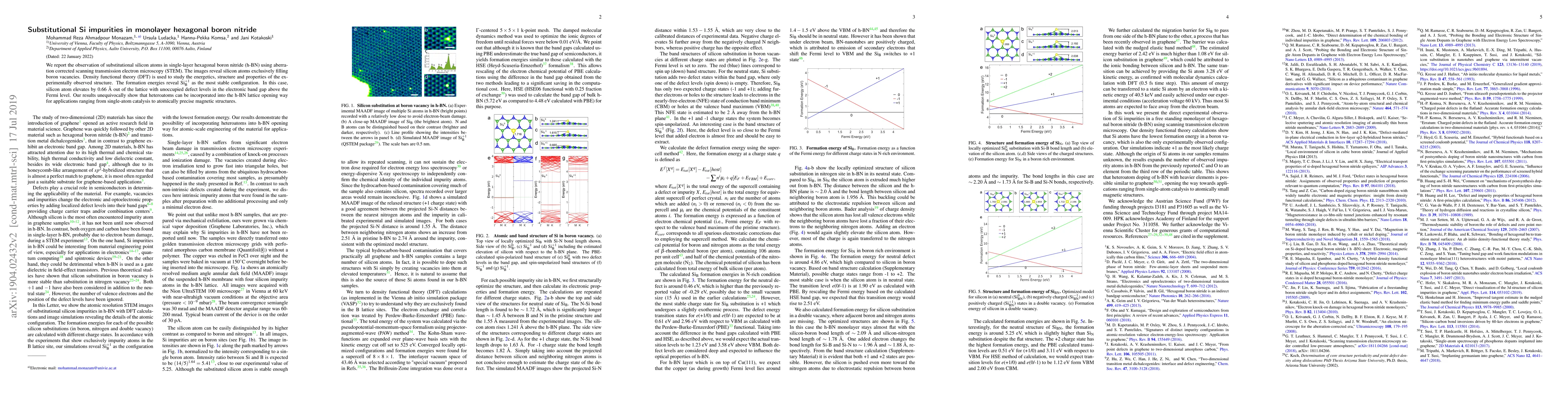 This study reports the first observation of substitutional silicon atoms in monolayer hexagonal boron nitride using advanced STEM techniques. DFT calculations reveal that Si$_\mathrm{B}^{+1}$ is the most stable configuration, suggesting potential for applications in catalysis and magnetic structures.