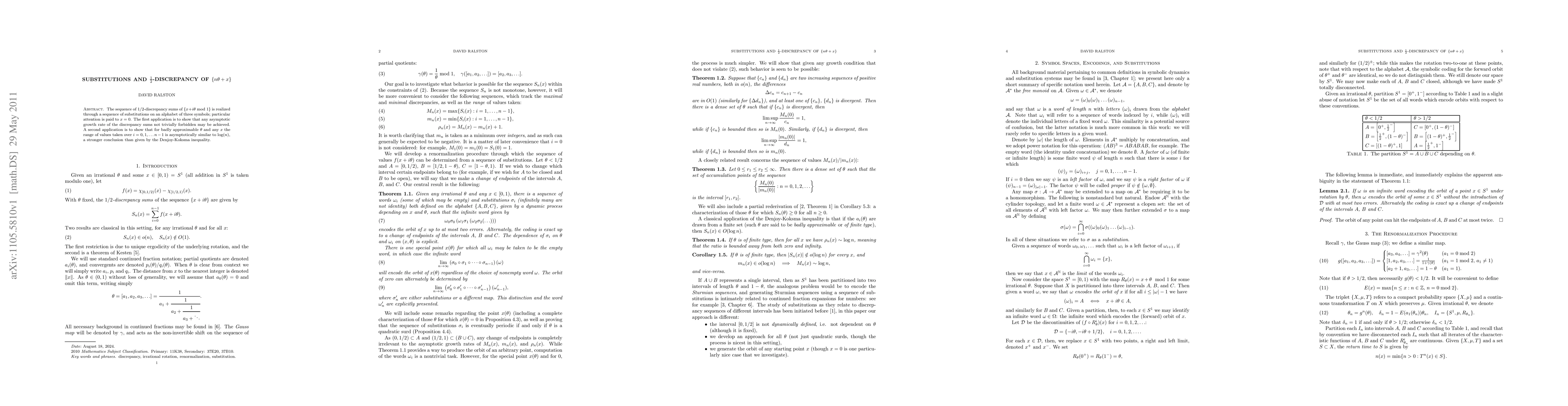 The sequence of 1/2-discrepancy sums of $\{x + i \theta \bmod 1\}$ is realized through a sequence of substitutions on an alphabet of three symbols; particular attention is paid to $x=0$. The first application is to show that any asymptotic growth rate of the discrepancy sums not trivially forbidden may be achieved. A second application is to show that for badly approximable $\theta$ and any $x$ the range of values taken over $i=0,1,...n-1$ is asymptotically similar to $\log(n)$, a stronger conclusion than given by the Denjoy-Koksma inequality.