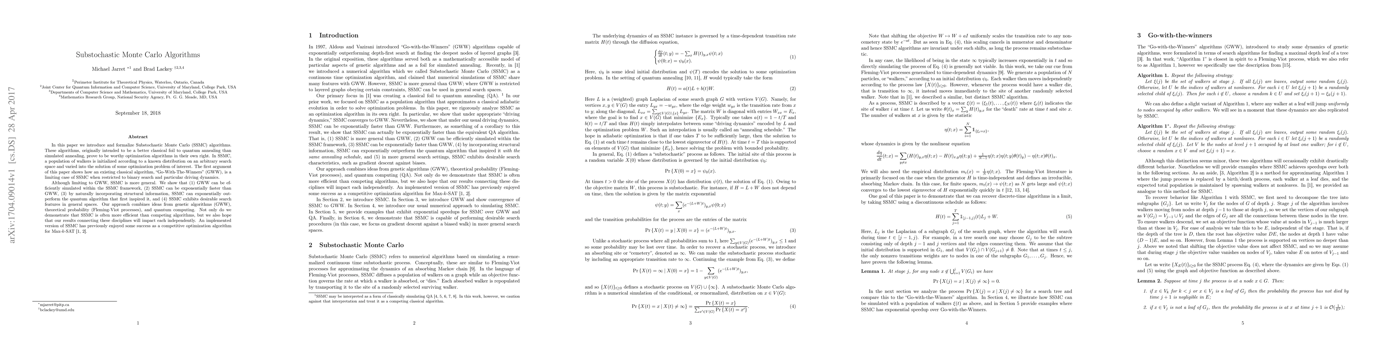 In this paper we introduce and formalize Substochastic Monte Carlo (SSMC) algorithms. These algorithms, originally intended to be a better classical foil to quantum annealing than simulated annealing, prove to be worthy optimization algorithms in their own right. In SSMC, a population of walkers is initialized according to a known distribution on an arbitrary search space and varied into the solution of some optimization problem of interest. The first argument of this paper shows how an existing classical algorithm, "Go-With-The-Winners" (GWW), is a limiting case of SSMC when restricted to binary search and particular driving dynamics. Although limiting to GWW, SSMC is more general. We show that (1) GWW can be efficiently simulated within the SSMC framework, (2) SSMC can be exponentially faster than GWW, (3) by naturally incorporating structural information, SSMC can exponentially outperform the quantum algorithm that first inspired it, and (4) SSMC exhibits desirable search features in general spaces. Our approach combines ideas from genetic algorithms (GWW), theoretical probability (Fleming-Viot processes), and quantum computing. Not only do we demonstrate that SSMC is often more efficient than competing algorithms, but we also hope that our results connecting these disciplines will impact each independently. An implemented version of SSMC has previously enjoyed some success as a competitive optimization algorithm for Max-$k$-SAT.