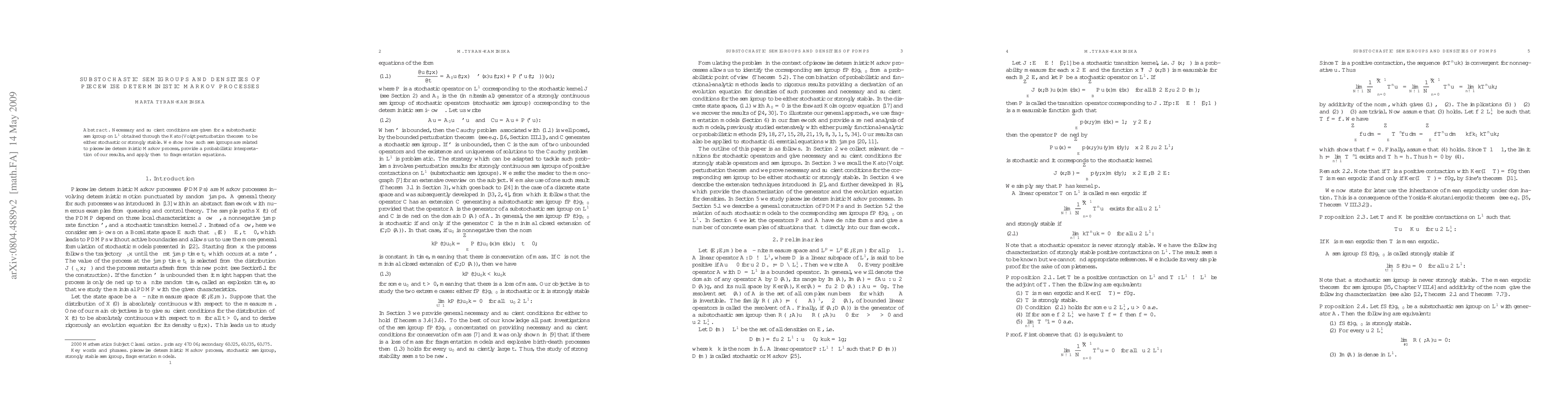 This paper establishes conditions for substochastic semigroups to be stochastic or strongly stable, linking them to piecewise deterministic Markov processes and applying the findings to fragmentation equations. The results provide a probabilistic interpretation of the semigroups' properties.