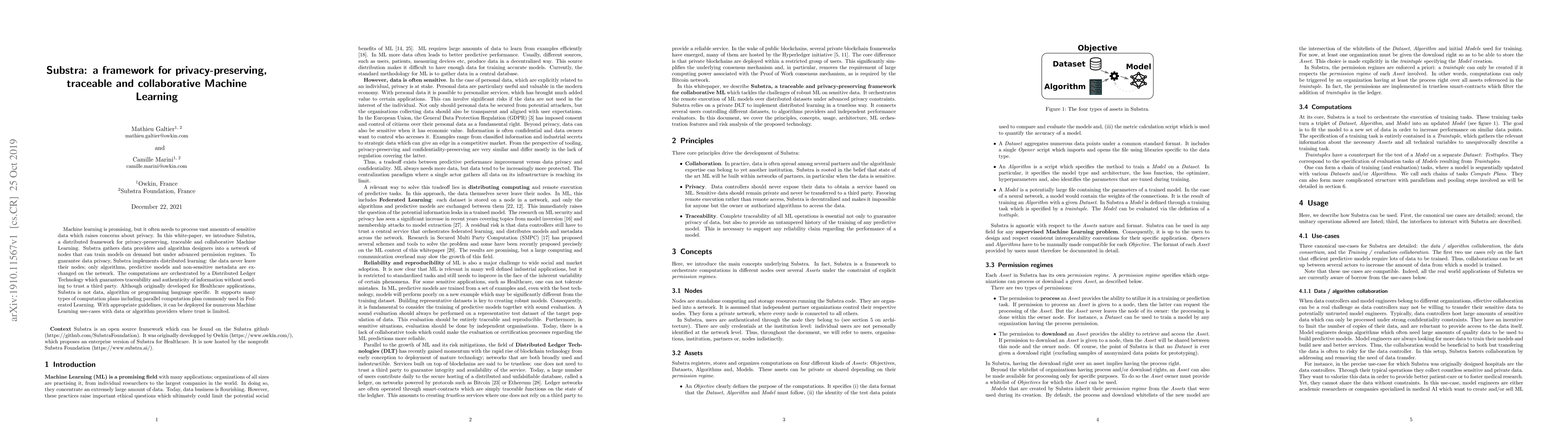 Machine learning is promising, but it often needs to process vast amounts of sensitive data which raises concerns about privacy. In this white-paper, we introduce Substra, a distributed framework for privacy-preserving, traceable and collaborative Machine Learning. Substra gathers data providers and algorithm designers into a network of nodes that can train models on demand but under advanced permission regimes. To guarantee data privacy, Substra implements distributed learning: the data never leave their nodes; only algorithms, predictive models and non-sensitive metadata are exchanged on the network. The computations are orchestrated by a Distributed Ledger Technology which guarantees traceability and authenticity of information without needing to trust a third party. Although originally developed for Healthcare applications, Substra is not data, algorithm or programming language specific. It supports many types of computation plans including parallel computation plan commonly used in Federated Learning. With appropriate guidelines, it can be deployed for numerous Machine Learning use-cases with data or algorithm providers where trust is limited.
