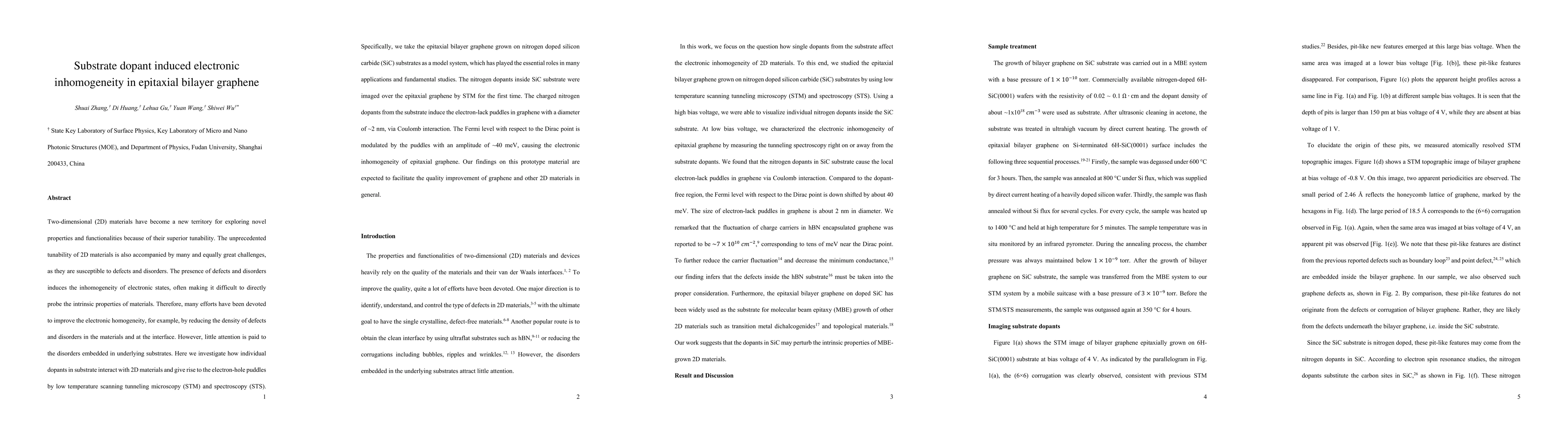 Two-dimensional (2D) materials have become a new territory for exploring novel properties and functionalities because of their superior tunability. The unprecedented tunability of 2D materials is also accompanied by many and equally great challenges, as they are susceptible to defects and disorders. The presence of defects and disorders induces the inhomogeneity of electronic states, often making it difficult to directly probe the intrinsic properties of materials. Therefore, many efforts have been devoted to improve the electronic homogeneity, for example, by reducing the density of defects and disorders in the materials and at the interface. However, little attention is paid to the disorders embedded in underlying substrates. Here we investigate how individual dopants in substrate interact with 2D materials and give rise to the electron-hole puddles by low temperature scanning tunneling microscopy (STM) and spectroscopy (STS). Specifically, we take the epitaxial bilayer graphene grown on nitrogen doped silicon carbide (SiC) substrates as a model system, which has played the essential roles in many applications and fundamental studies. The nitrogen dopants inside SiC substrate were imaged over the epitaxial graphene by STM for the first time. The charged nitrogen dopants from the substrate induce the electron-lack puddles in graphene with a diameter of ~2 nm, via Coulomb interaction. The Fermi level with respect to the Dirac point is modulated by the puddles with an amplitude of ~40 meV, causing the electronic inhomogeneity of epitaxial graphene. Our findings on this prototype material are expected to facilitate the quality improvement of graphene and other 2D materials in general.