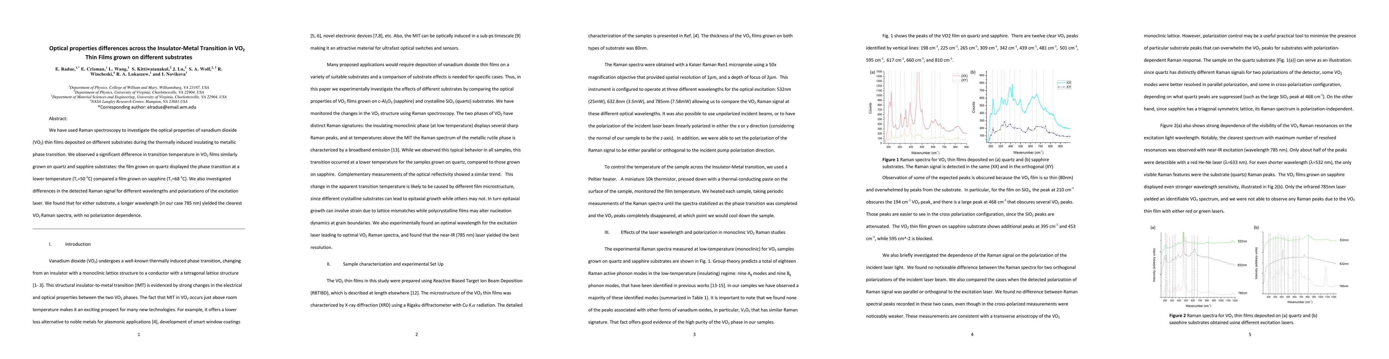 This study uses Raman spectroscopy to examine the optical properties of vanadium dioxide (VO2) thin films during their phase transition, finding that films on quartz substrates transition at 50°C while those on sapphire substrates transition at 68°C. Longer wavelength excitation (785 nm) provided the clearest Raman spectra without polarization dependence.