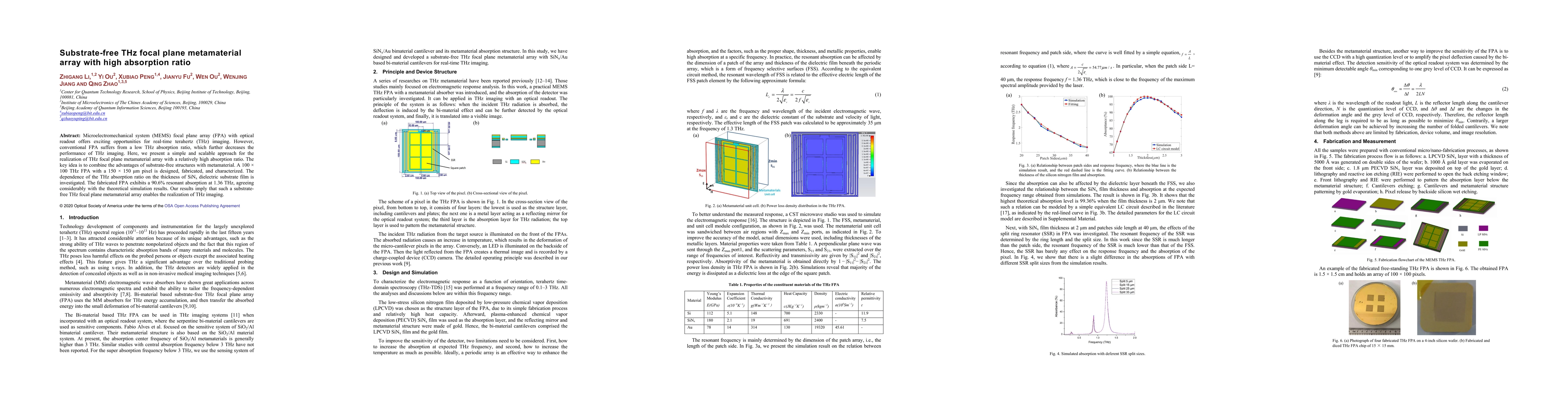 This paper presents a substrate-free THz focal plane metamaterial array that achieves high absorption ratios, addressing the low THz absorption issue of conventional arrays. The fabricated 100 x100 pixel FPA demonstrates a resonant absorption of 90.6% at 1.36 THz, indicating potential for improved THz imaging.