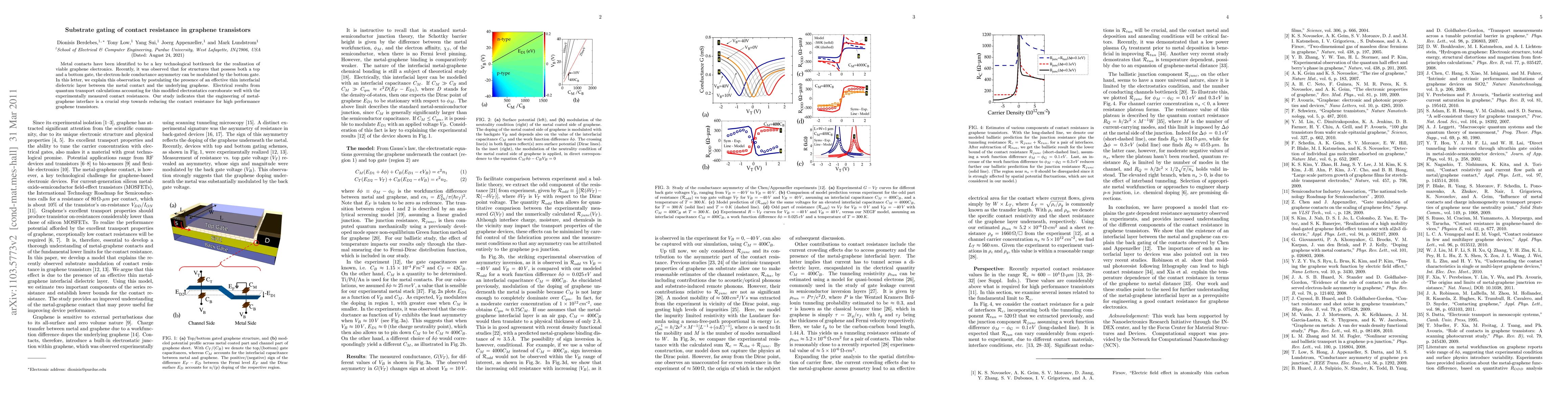 This study reveals that the contact resistance in graphene transistors can be modulated by substrate gating through an effective thin interfacial dielectric layer between the metal contact and graphene, as confirmed by quantum transport calculations and experimental measurements. Engineering the metal-graphene interface is identified as vital for achieving low contact resistance in high-performance graphene transistors.