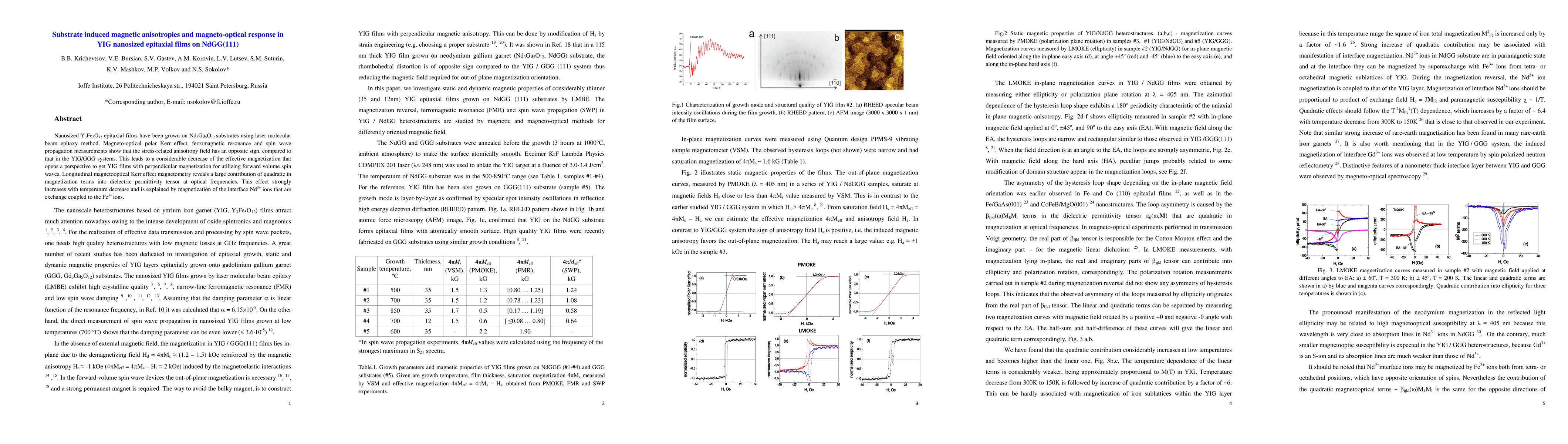 This paper investigates Y3Fe5O12 nanosized films grown on Nd3Ga5O12 substrates, revealing substrate-induced magnetic anisotropies and a magneto-optical response differing from YIG/GGG systems, potentially enabling perpendicular magnetization for spin wave applications. Temperature-dependent studies show significant quadratic magnetization effects in the dielectric permittivity tensor, attributed to interface Nd3+ ion magnetization.
