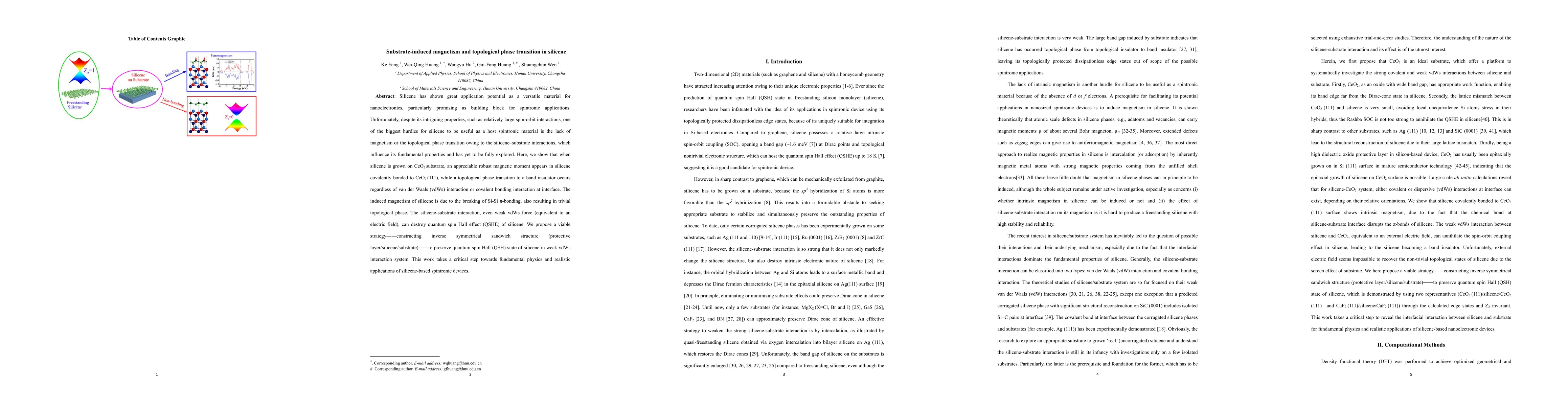 This paper demonstrates that silicene grown on a CeO2 substrate exhibits induced magnetism and a topological phase transition due to substrate interactions, proposing an inverse symmetrical sandwich structure to preserve its quantum spin Hall state. The work highlights the potential of silicene for spintronic applications despite substrate-induced challenges.