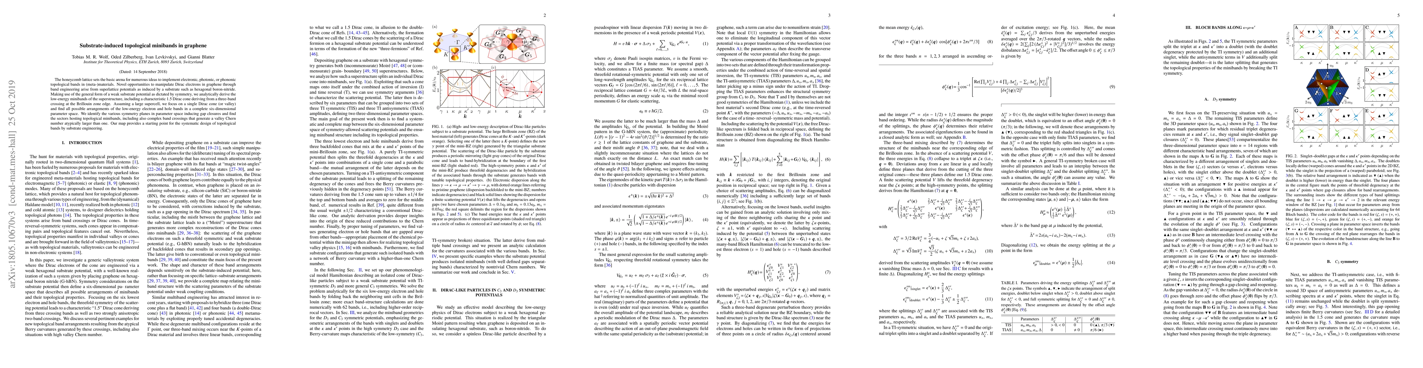 The honeycomb lattice sets the basic arena for numerous ideas to implement electronic, photonic, or phononic topological bands in (meta-)materials. Novel opportunities to manipulate Dirac electrons in graphene through band engineering arise from superlattice potentials as induced by a substrate such as hexagonal boron-nitride. Making use of the general form of a weak substrate potential as dictated by symmetry, we analytically derive the low-energy minibands of the superstructure, including a characteristic 1.5 Dirac cone deriving from a three-band crossing at the Brillouin zone edge. Assuming a large supercell, we focus on a single Dirac cone (or valley) and find all possible arrangements of the low-energy electron and hole bands in a complete six-dimensional parameter space. We identify the various symmetry planes in parameter space inducing gap closures and find the sectors hosting topological minibands, including also complex band crossings that generate a valley Chern number atypically larger than one. Our map provides a starting point for the systematic design of topological bands by substrate engineering.