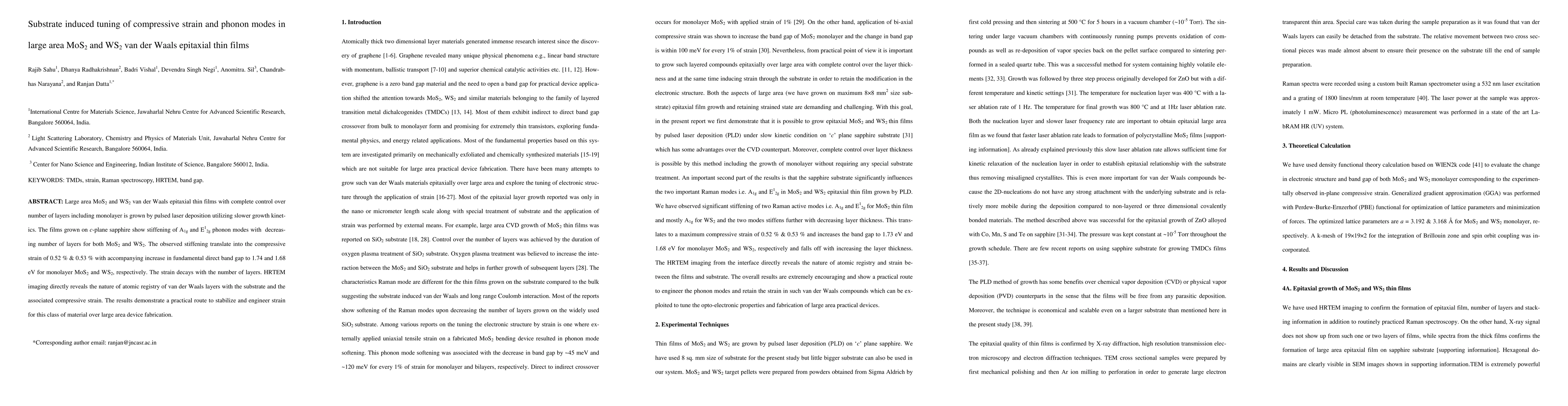 This paper investigates the substrate-induced tuning of compressive strain and phonon modes in large area MoS2 and WS2 van der Waals epitaxial thin films grown by pulsed laser deposition. The study reveals a stiffening of phonon modes and an increase in the fundamental direct band gap with decreasing layer number, demonstrating a practical method for strain engineering in these materials.