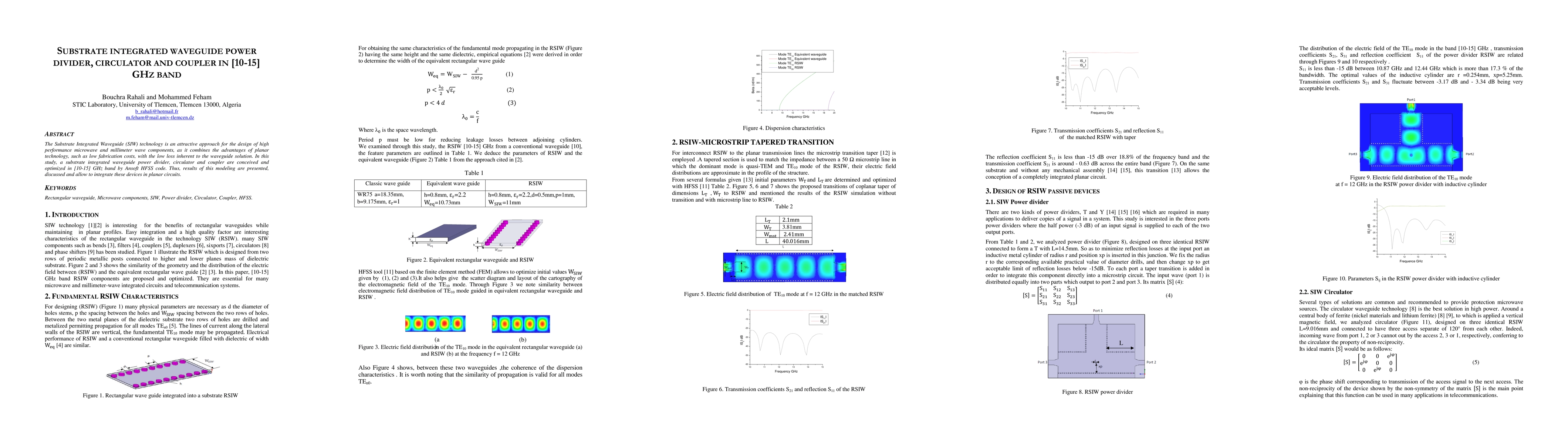 The Substrate Integrated Waveguide (SIW) technology is an attractive approach for the design of high performance microwave and millimeter wave components, as it combines the advantages of planar technology, such as low fabrication costs, with the low loss inherent to the waveguide solution. In this study, a substrate integrated waveguide power divider, circulator and coupler are conceived and optimized in [10-15] GHz band by Ansoft HFSS code. Thus, results of this modeling are presented, discussed and allow to integrate these devices in planar circuits.