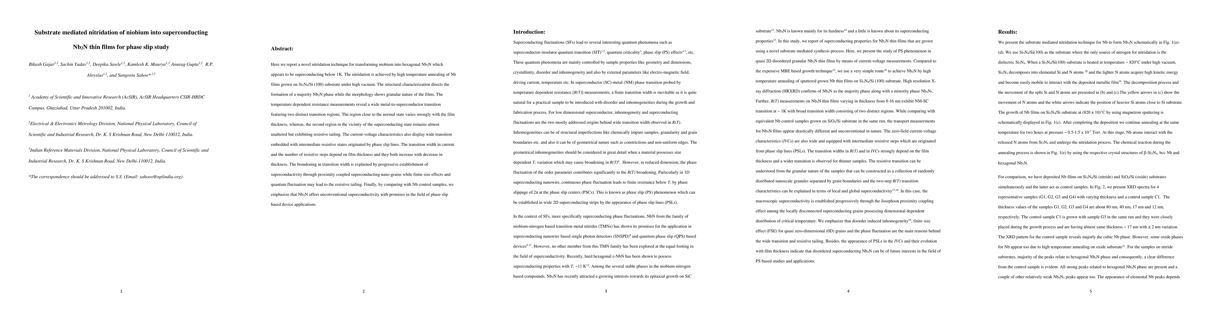 This paper presents a new method for nitridation of niobium to form superconducting Nb2N thin films, showing superconductivity below 1K. The technique involves high-temperature annealing on a Si3N4/Si substrate, resulting in a granular Nb2N film with a wide metal-to-superconductor transition and phase slip behavior influenced by film thickness.