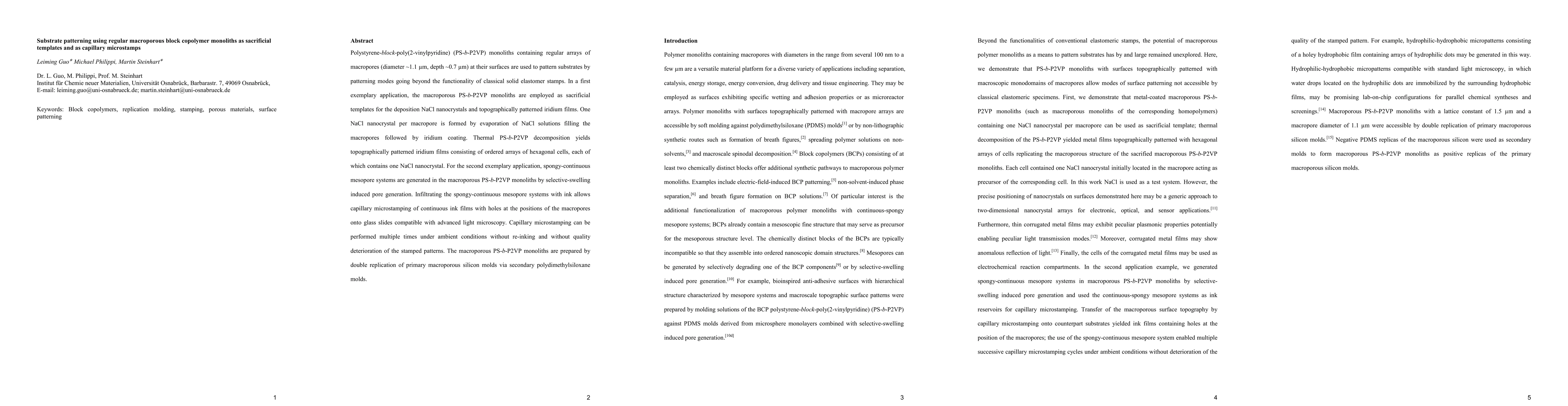 This paper explores the use of regular macroporous polystyrene-block-poly(2-vinylpyridine) monoliths as sacrificial templates and capillary microstamps for substrate patterning. The monoliths enable the deposition of NaCl nanocrystals and the creation of topographically patterned iridium films, as well as the capillary microstamping of continuous ink films on glass slides, demonstrating versatile patterning capabilities.