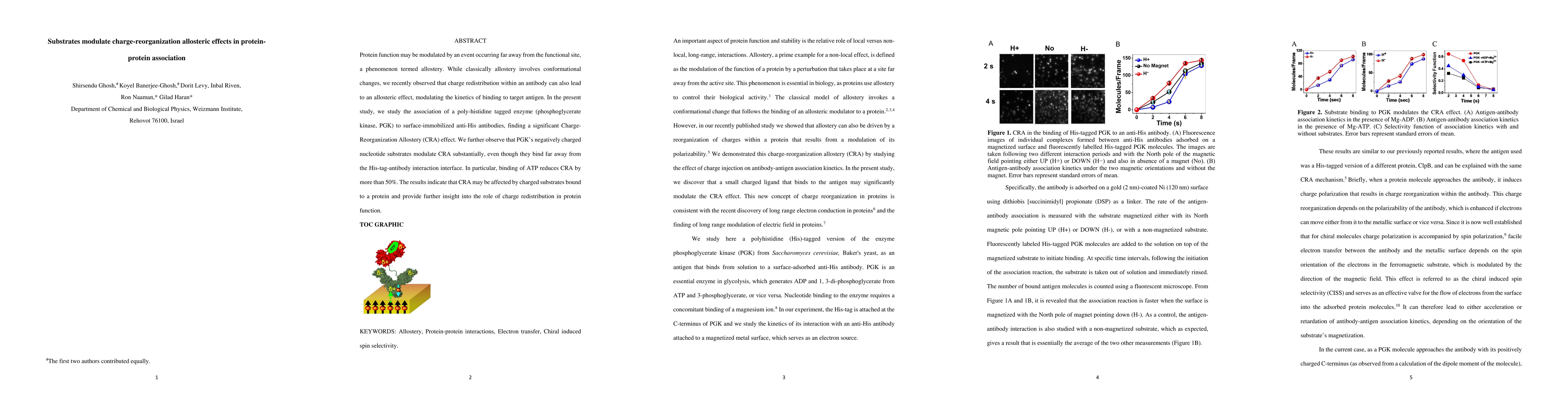 Protein function may be modulated by an event occurring far away from the functional site, a phenomenon termed allostery. While classically allostery involves conformational changes, we recently observed that charge redistribution within an antibody can also lead to an allosteric effect, modulating the kinetics of binding to target antigen. In the present study, we study the association of a poly-histidine tagged enzyme (phosphoglycerate kinase, PGK) to surface-immobilized anti-His antibodies, finding a significant Charge-Reorganization Allostery (CRA) effect. We further observe that the negatively charged nucleotide substrates of PGK modulate CRA substantially, even though they bind far away from the His-tag-antibody interaction interface. In particular, binding of ATP reduces CRA by more than 50%. The results indicate that CRA may be affected by charged substrates bound to a protein and provide further insight into the role of charge redistribution in protein function.