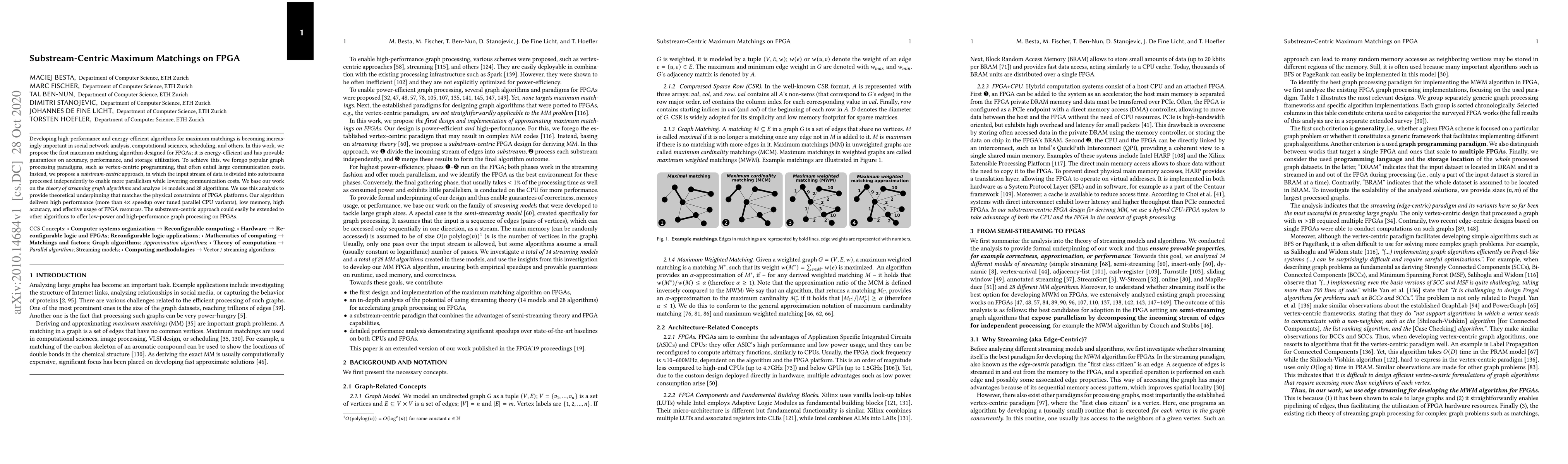 This paper proposes a substream-centric maximum matching algorithm for FPGAs, achieving high performance, low energy consumption, and efficient resource utilization by dividing data streams into substreams for independent processing. The approach offers significant speedup over parallel CPU variants and provides theoretical guarantees on accuracy and resource usage.