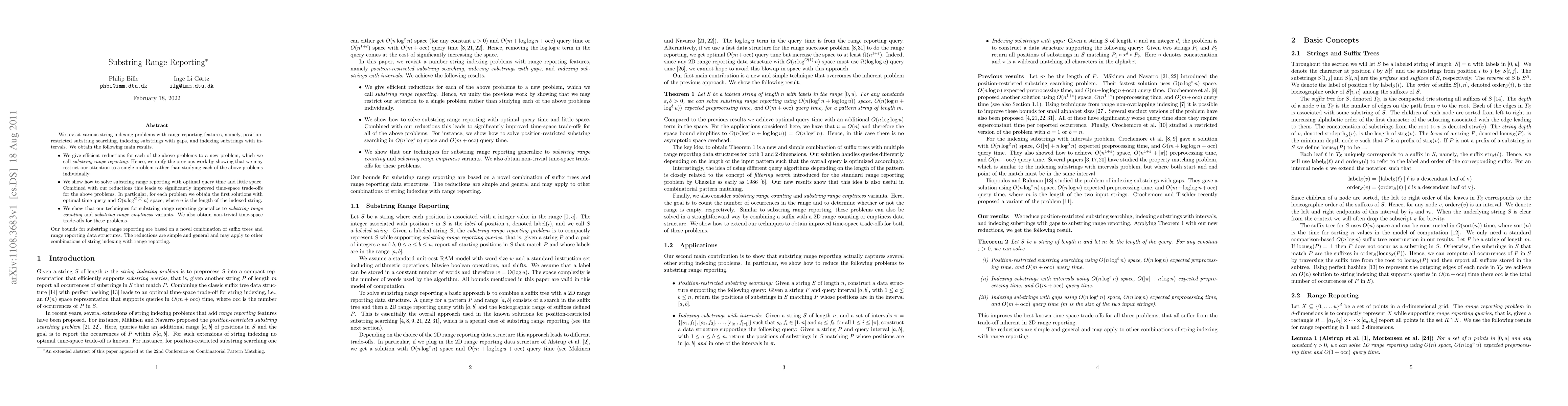 This paper unifies various string indexing problems, such as position-restricted substring searching, by reducing them to a new problem called substring range reporting. It presents optimal query time solutions with minimal space for these problems, leveraging a novel combination of suffix trees and range reporting data structures.