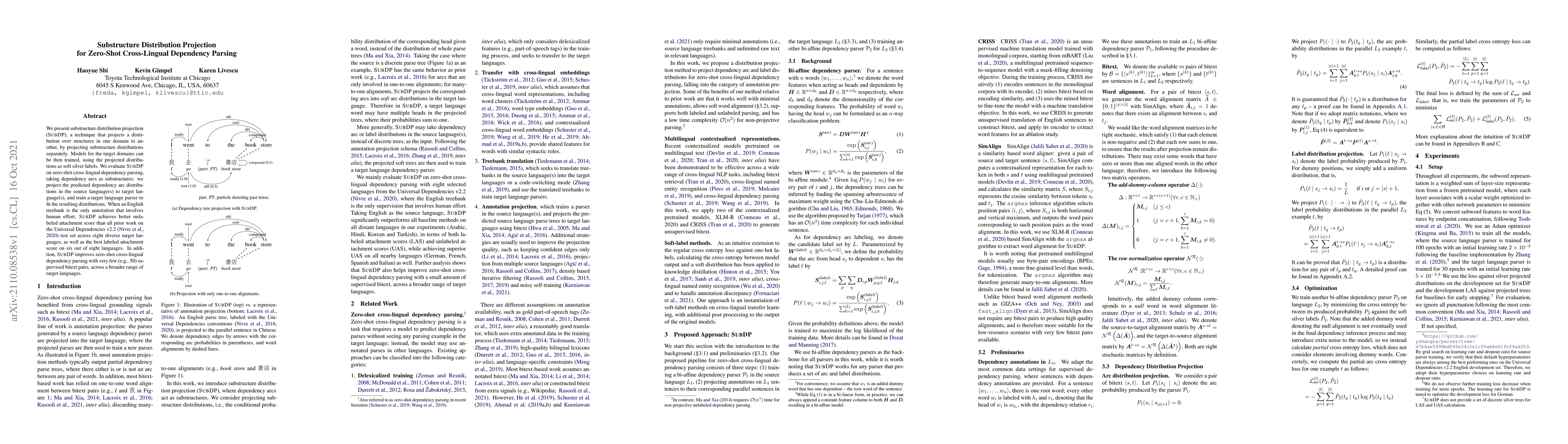 Substructure Distribution Projection (SubDP) projects dependency arc distributions from a source language to target languages, enhancing zero-shot cross-lingual dependency parsing. SubDP achieves superior performance on Universal Dependencies test sets across multiple languages with minimal supervision.