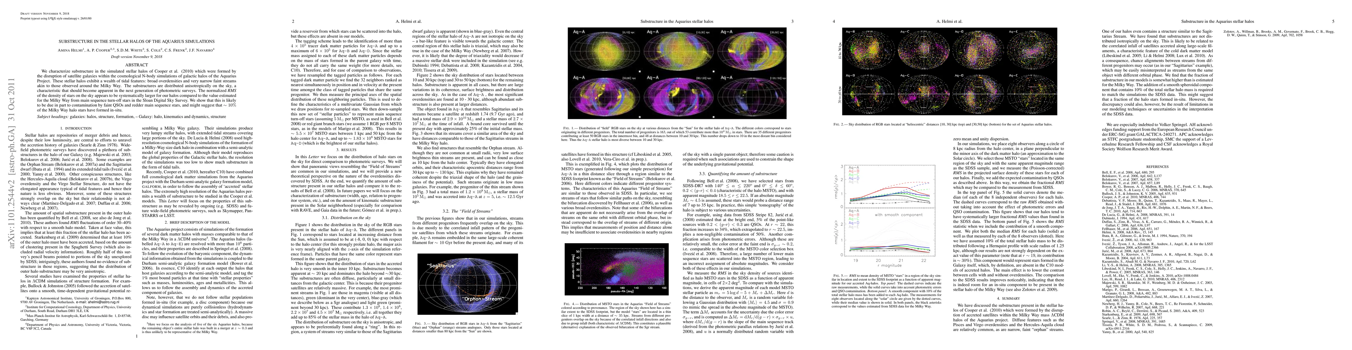 We characterize substructure in the simulated stellar halos of Cooper et al. (2010) which were formed by the disruption of satellite galaxies within the cosmological N-body simulations of galactic halos of the Aquarius Project. These stellar halos exhibit a wealth of tidal features: broad overdensities and very narrow faint streams akin to those observed around the Milky Way. The substructures are distributed anisotropically on the sky, a characteristic that should become apparent in the next generation of photometric surveys. The normalized RMS of the density of stars on the sky appears to be systematically larger for our halos compared to the value estimated for the Milky Way from main sequence turn-off stars in the Sloan Digital Sky Survey. We show that this is likely to be due in part to contamination by faint QSOs and redder main sequence stars, and might suggest that ~10% of the Milky Way halo stars have formed in-situ.