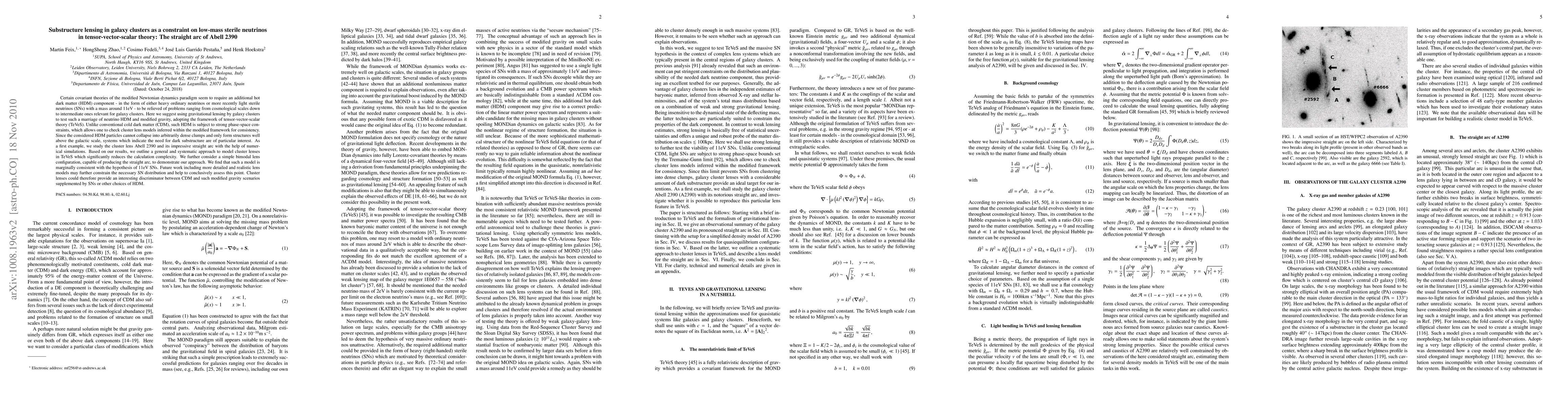 Certain covariant theories of the modified Newtonian dynamics paradigm seem to require an additional hot dark matter (HDM) component - in the form of either heavy ordinary neutrinos or more recently light sterile neutrinos (SNs) with a mass around 11eV - to be relieved of problems ranging from cosmological scales down to intermediate ones relevant for galaxy clusters. Here we suggest using gravitational lensing by galaxy clusters to test such a marriage of neutrino HDM and modified gravity, adopting the framework of tensor-vector-scalar theory (TeVeS). Unlike conventional cold dark matter (CDM), such HDM is subject to strong phase-space constraints, which allows one to check cluster lens models inferred within the modified framework for consistency. Since the considered HDM particles cannot collapse into arbitrarily dense clumps and only form structures well above the galactic scale, systems which indicate the need for dark substructure are of particular interest. As a first example, we study the cluster lens Abell 2390 and its impressive straight arc with the help of numerical simulations. Based on our results, we outline a general and systematic approach to model cluster lenses in TeVeS which significantly reduces the calculation complexity. We further consider a simple bimodal lens configuration, capable of producing the straight arc, to demonstrate our approach. We find that such a model is marginally consistent with the hypothesis of 11eV SNs. Future work including more detailed and realistic lens models may further constrain the necessary SN distribution and help to conclusively assess this point. Cluster lenses could therefore provide an interesting discriminator between CDM and such modified gravity scenarios supplemented by SNs or other choices of HDM.
