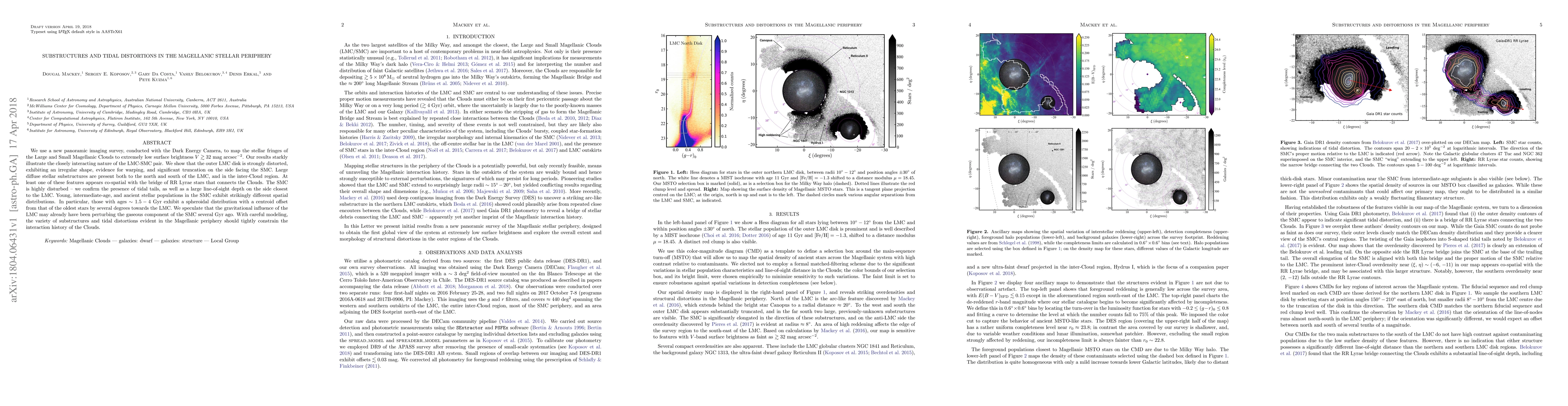 We use a new panoramic imaging survey, conducted with the Dark Energy Camera, to map the stellar fringes of the Large and Small Magellanic Clouds to extremely low surface brightness V $\gtrsim$ 32 mag arcsec$^{-2}$. Our results starkly illustrate the closely interacting nature of the LMC-SMC pair. We show that the outer LMC disk is strongly distorted, exhibiting an irregular shape, evidence for warping, and significant truncation on the side facing the SMC. Large diffuse stellar substructures are present both to the north and south of the LMC, and in the inter-Cloud region. At least one of these features appears co-spatial with the bridge of RR Lyrae stars that connects the Clouds. The SMC is highly disturbed -- we confirm the presence of tidal tails, as well as a large line-of-sight depth on the side closest to the LMC. Young, intermediate-age, and ancient stellar populations in the SMC exhibit strikingly different spatial distributions. In particular, those with ages $\sim$ 1.5-4 Gyr exhibit a spheroidal distribution with a centroid offset from that of the oldest stars by several degrees towards the LMC. We speculate that the gravitational influence of the LMC may already have been perturbing the gaseous component of the SMC several Gyr ago. With careful modeling, the variety of substructures and tidal distortions evident in the Magellanic periphery should tightly constrain the interaction history of the Clouds.