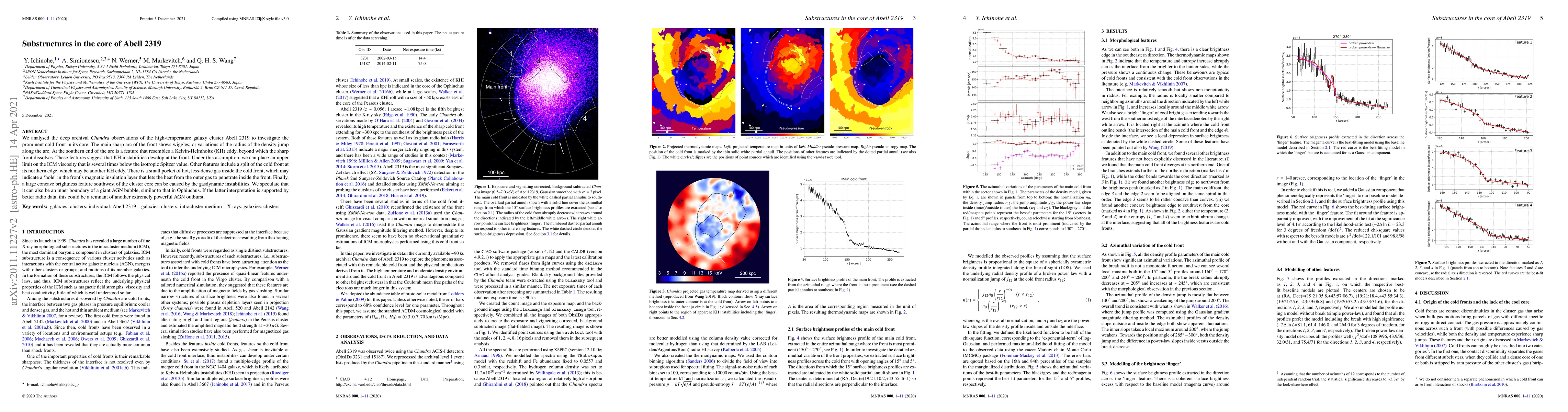 We analysed the deep archival Chandra observations of the high-temperature galaxy cluster Abell 2319 to investigate the prominent cold front in its core. The main sharp arc of the front shows wiggles, or variations of the radius of the density jump along the arc. At the southern end of the arc is a feature that resembles a Kelvin-Helmholtz (KH) eddy, beyond which the sharp front dissolves. These features suggest that KH instabilities develop at the front. Under this assumption, we can place an upper limit on the ICM viscosity that is several times below the isotropic Spitzer value. Other features include a split of the cold front at its northern edge, which may be another KH eddy. There is a small pocket of hot, less-dense gas inside the cold front, which may indicate a `hole' in the front's magnetic insulation layer that lets the heat from the outer gas to penetrate inside the front. Finally, a large concave brightness feature southwest of the cluster core can be caused by the gasdynamic instabilities. We speculate that it can also be an inner boundary of a giant AGN bubble, similar to that in Ophiuchus. If the latter interpretation is supported by better radio data, this could be a remnant of another extremely powerful AGN outburst.