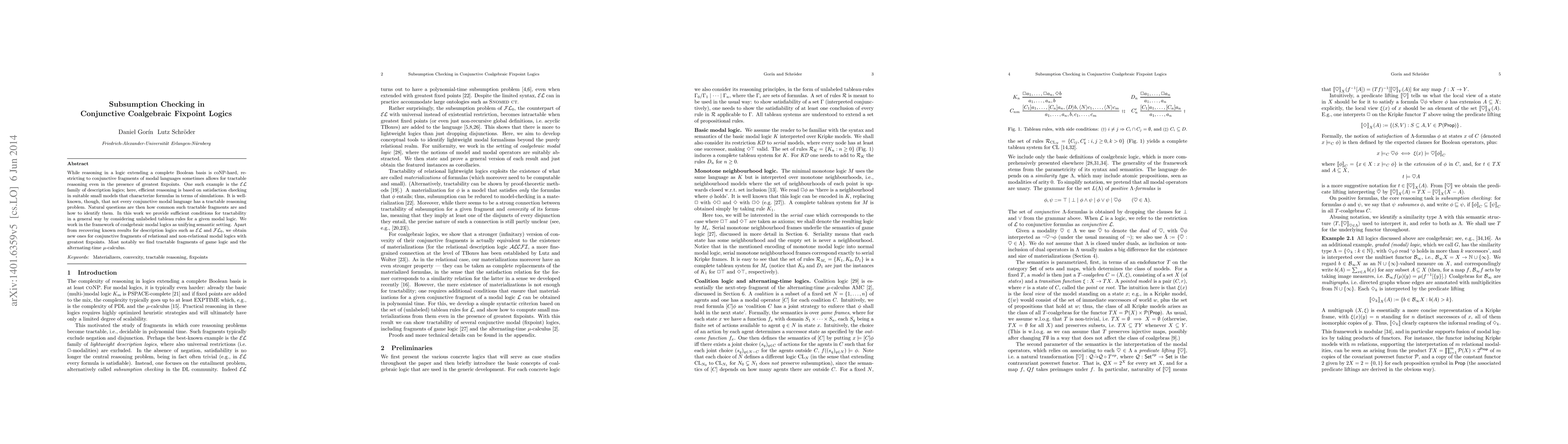 While reasoning in a logic extending a complete Boolean basis is coNP-hard, restricting to conjunctive fragments of modal languages sometimes allows for tractable reasoning even in the presence of greatest fixpoints. One such example is the EL family of description logics; here, efficient reasoning is based on satisfaction checking in suitable small models that characterize formulas in terms of simulations. It is well-known, though, that not every conjunctive modal language has a tractable reasoning problem. Natural questions are then how common such tractable fragments are and how to identify them. In this work we provide sufficient conditions for tractability in a general way by considering unlabeled tableau rules for a given modal logic. We work in the framework of coalgebraic logic as a unifying semantic setting. Apart from recovering known results for description logics such as EL and FL0, we obtain new ones for conjunctive fragments of relational and non-relational modal logics with greatest fixpoints. Most notably we find tractable fragments of game logic and the alternating-time mu-calculus.
