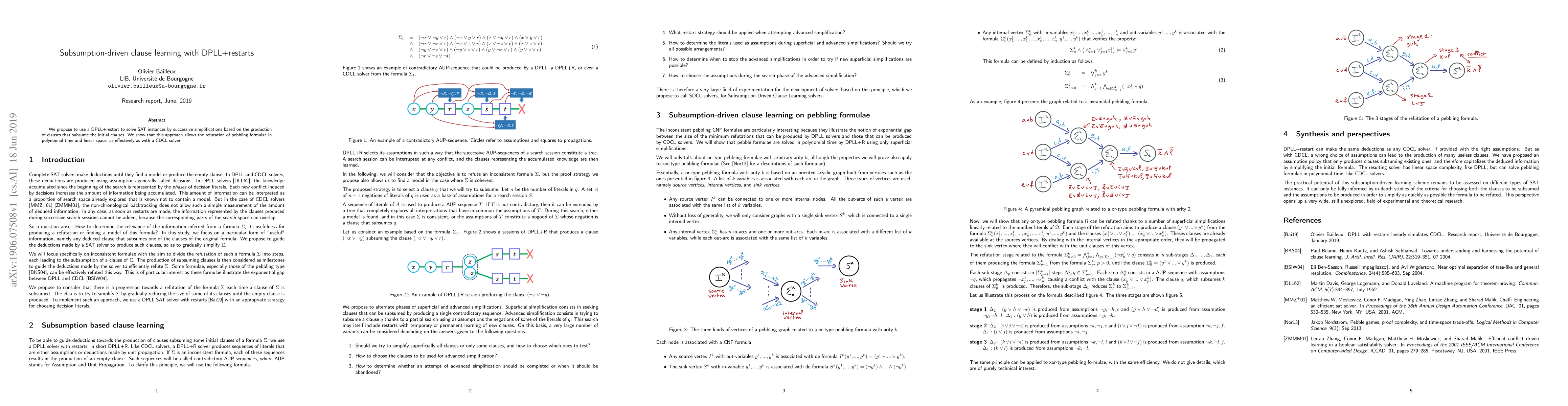 We propose to use a DPLL+restart to solve SAT instances by successive simplifications based on the production of clauses that subsume the initial clauses. We show that this approach allows the refutation of pebbling formulae in polynomial time and linear space, as effectively as with a CDCL solver.
