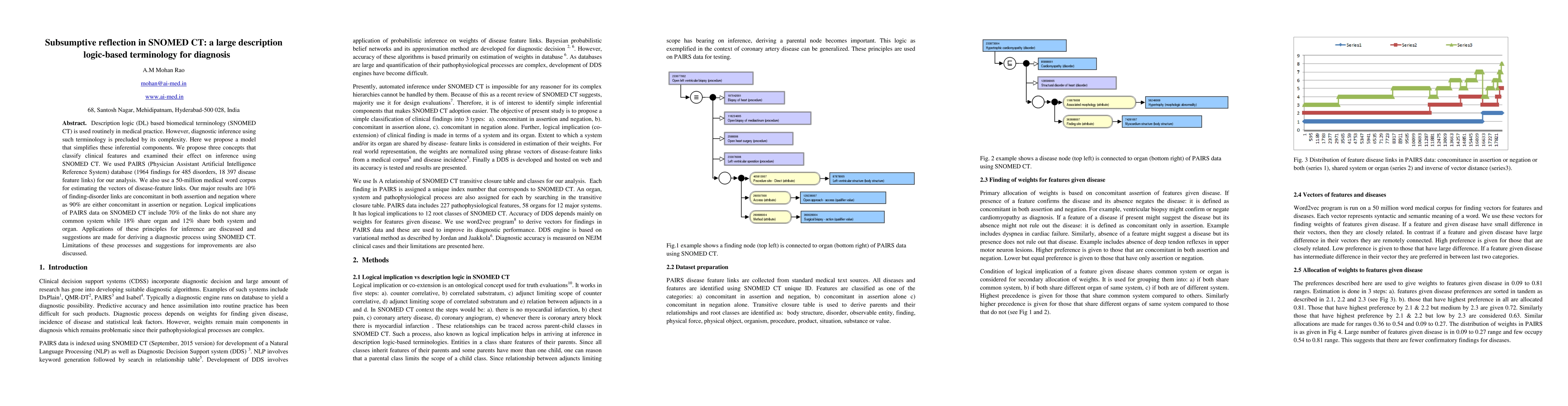 Description logic (DL) based biomedical terminology (SNOMED CT) is used routinely in medical practice. However, diagnostic inference using such terminology is precluded by its complexity. Here we propose a model that simplifies these inferential components. We propose three concepts that classify clinical features and examined their effect on inference using SNOMED CT. We used PAIRS (Physician Assistant Artificial Intelligence Reference System) database (1964 findings for 485 disorders, 18 397 disease feature links) for our analysis. We also use a 50-million medical word corpus for estimating the vectors of disease-feature links. Our major results are 10% of finding-disorder links are concomitant in both assertion and negation where as 90% are either concomitant in assertion or negation. Logical implications of PAIRS data on SNOMED CT include 70% of the links do not share any common system while 18% share organ and 12% share both system and organ. Applications of these principles for inference are discussed and suggestions are made for deriving a diagnostic process using SNOMED CT. Limitations of these processes and suggestions for improvements are also discussed.