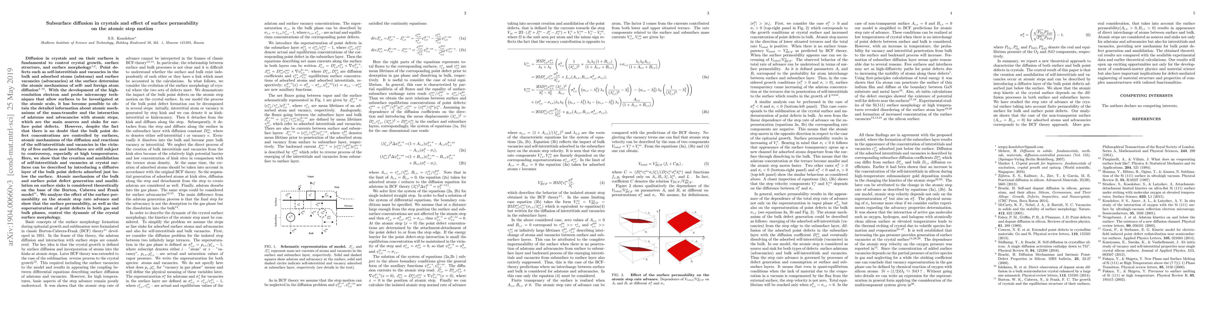 Atomic mechanism of the bulk and surface point defect generation and annihilation on surface sinks is considered theoretically on the base of the Burton, Cabrera and Frank model. We show that the creation and annihilation of self-interstitials and vacancies at crystal surfaces can be described by introducing a diffusive layer of the bulk point defects adsorbed just below the surface. The effect of the surface permeability on the atomic step rate advance is analyzed. We conclude that the surface permeability, as well as the supersaturation of point defects in both gas and bulk phases, control the dynamic of the crystal surface morphology.