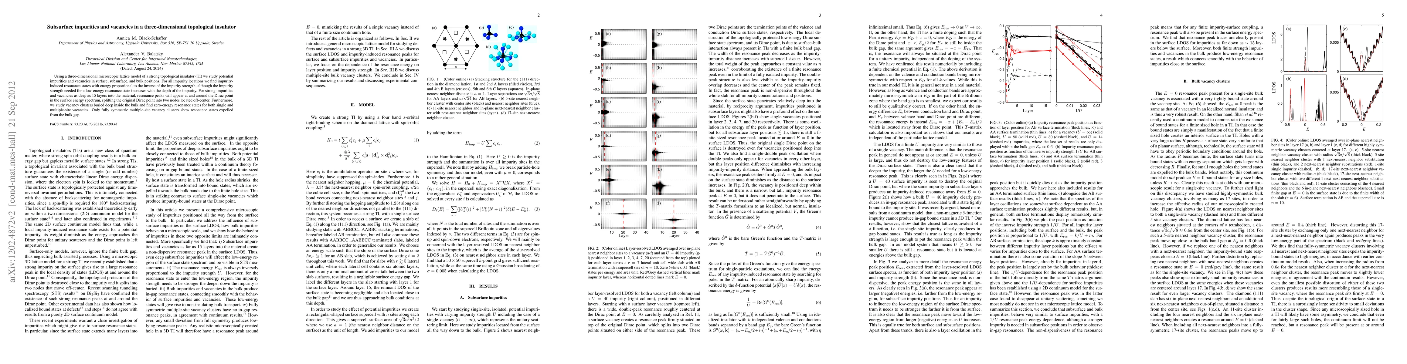 Using a three-dimensional microscopic lattice model of a strong topological insulator (TI) we study potential impurities and vacancies in surface and subsurface positions. For all impurity locations we find impurity-induced resonance states with energy proportional to the inverse of the impurity strength, although the impurity strength needed for a low-energy resonance state increases with the depth of the impurity. For strong impurities and vacancies as deep as 15 layers into the material, resonance peaks will appear at and around the Dirac point in the surface energy spectrum, splitting the original Dirac point into two nodes located off-center. Furthermore, we study vacancy clusters buried deep inside the bulk and find zero-energy resonance states for both single and multiple-site vacancies. Only fully symmetric multiple-site vacancy clusters show resonance states expelled from the bulk gap.