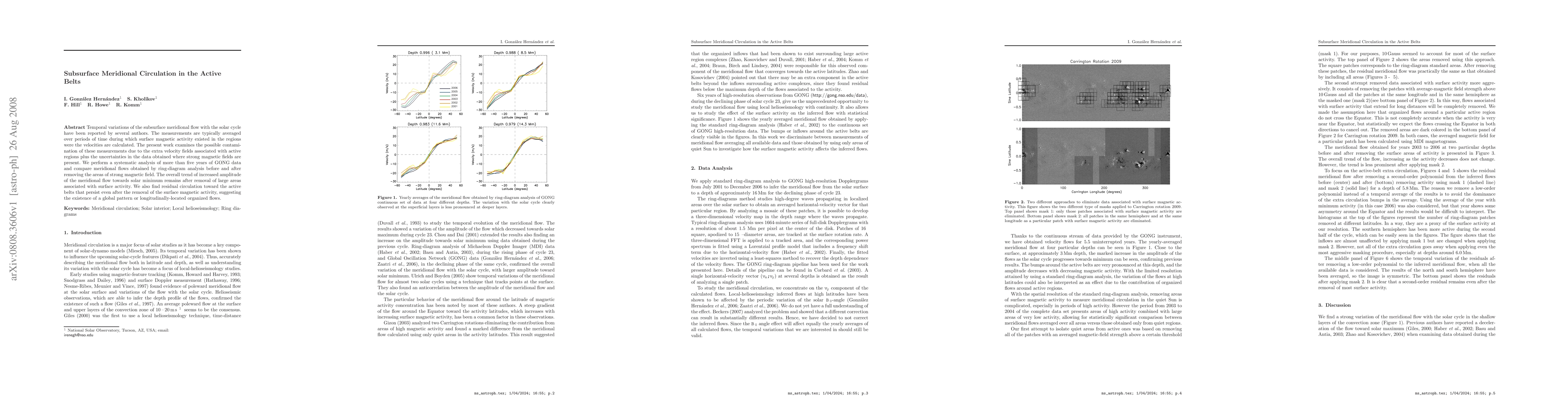 This study investigates subsurface meridional circulation in solar active belts using five years of GONG data, finding that the increased amplitude towards solar minimum persists even after removing areas of strong magnetic activity. Residual circulation towards active belts indicates a global pattern or organized longitudinal flows.