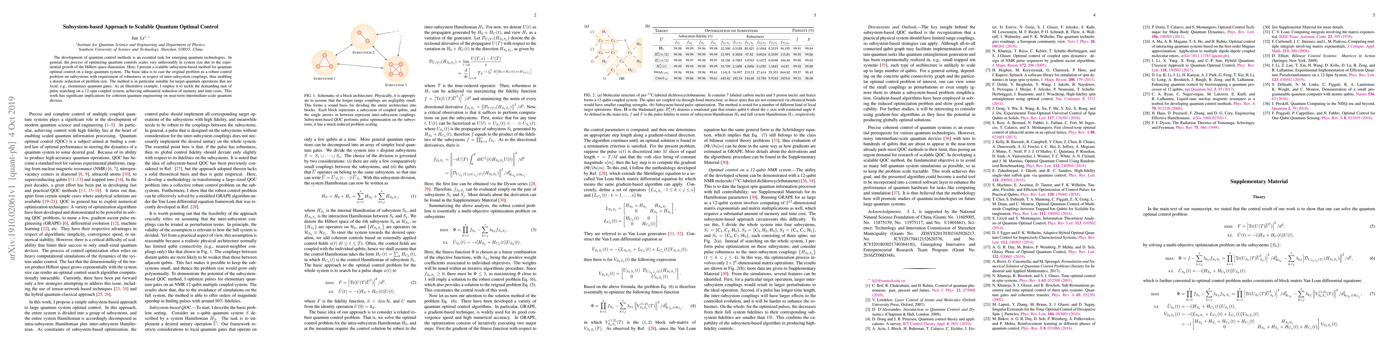 The development of quantum control methods is an essential task for emerging quantum technologies. In general, the process of optimizing quantum controls scales very unfavorably in system size due to the exponential growth of the Hilbert space dimension. Here, I present a scalable subsystem-based method for quantum optimal control on a large quantum system. The basic idea is to cast the original problem as a robust control problem on subsystems with requirement of robustness in respect of inter-subsystem couplings, thus enabling a drastic reduction of problem size. The method is in particular suitable for target quantum operations that are local, e.g., elementary quantum gates. As an illustrative example, I employ it to tackle the demanding task of pulse searching on a 12-spin coupled system, achieving substantial reduction of memory and time costs. This work has significant implications for coherent quantum engineering on near-term intermediate-scale quantum devices.