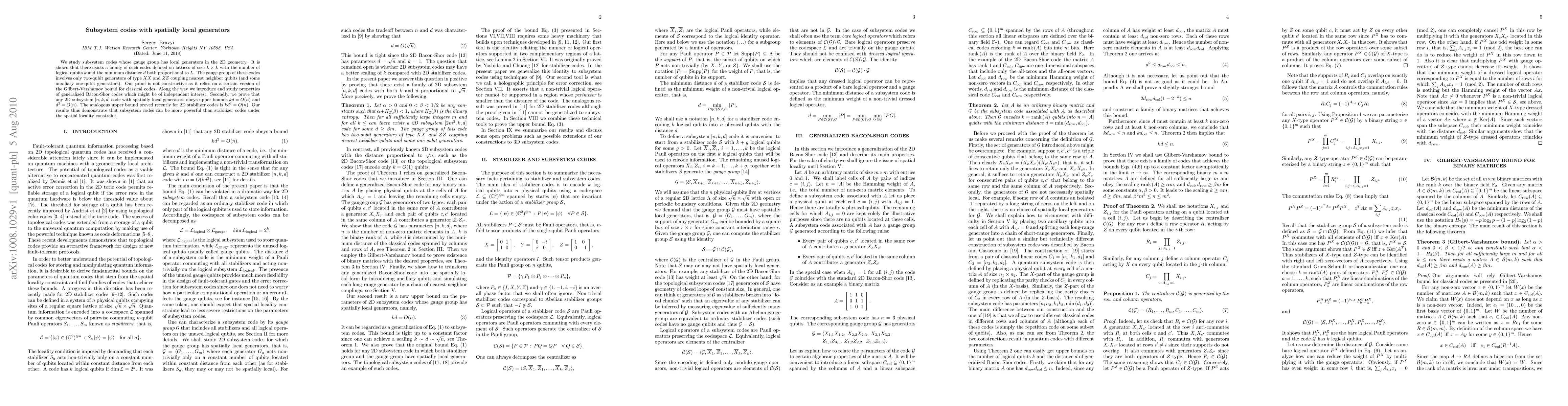 We study subsystem codes whose gauge group has local generators in the 2D geometry. It is shown that there exists a family of such codes defined on lattices of size LxL with the number of logical qubits k and the minimum distance d both proportional to L. The gauge group of these codes involves only two-qubit generators of type XX and ZZ coupling nearest neighbor qubits (and some auxiliary one-qubit generators). Our proof is not constructive as it relies on a certain version of the Gilbert-Varshamov bound for classical codes. Along the way we introduce and study properties of generalized Bacon-Shor codes which might be of independent interest. Secondly, we prove that any 2D subsystem [n,k,d] code with spatially local generators obeys upper bounds kd=O(n) and d^2=O(n). The analogous upper bound proved recently for 2D stabilizer codes is kd^2=O(n). Our results thus demonstrate that subsystem codes can be more powerful than stabilizer codes under the spatial locality constraint.