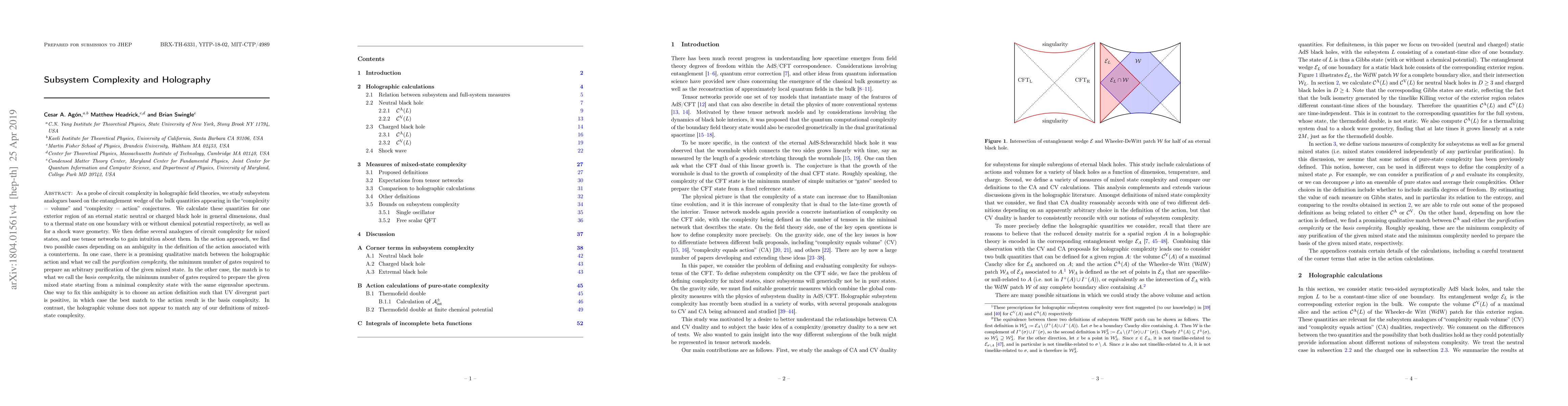We study circuit complexity for spatial regions in holographic field theories. We study analogues based on the entanglement wedge of the bulk quantities appearing in the "complexity = volume" and "complexity = action" conjectures. We calculate these quantities for one exterior region of an eternal static neutral or charged black hole in general dimensions, dual to a thermal state on one boundary with or without chemical potential respectively, as well as for a shock wave geometry. We then define several analogues of circuit complexity for mixed states, and use tensor networks to gain intuition about them. We find a promising qualitative match between the holographic action and what we call the purification complexity, the minimum number of gates required to prepare an arbitrary purification of the given mixed state. On the other hand, the holographic volume does not appear to match any of our definitions of mixed-state complexity.