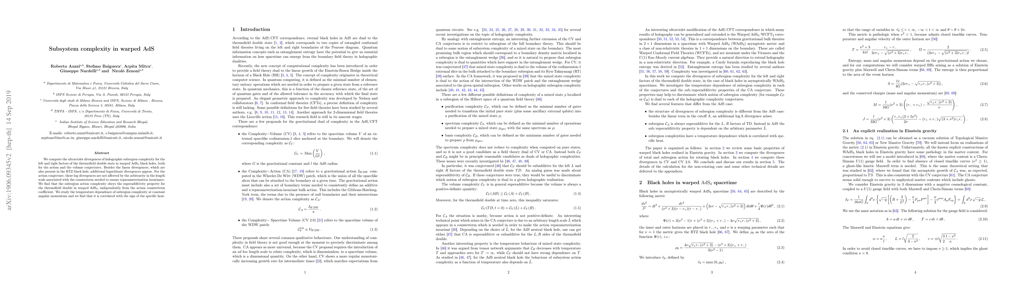 We compute the ultraviolet divergences of holographic subregion complexity for the left and right factors of the thermofield double state in warped AdS$_3$ black holes, both for the action and the volume conjectures. Besides the linear divergences, which are also present in the BTZ black hole, additional logarithmic divergences appear. For the action conjecture, these log divergences are not affected by the arbitrarity in the length scale associated with the counterterm needed to ensure reparameterization invariance. We find that the subregion action complexity obeys the superadditivity property for the thermofield double in warped AdS$_3$, independently from the action counterterm coefficient. We study the temperature dependence of subregion complexity at constant angular momentum and we find that it is correlated with the sign of the specific heat.
