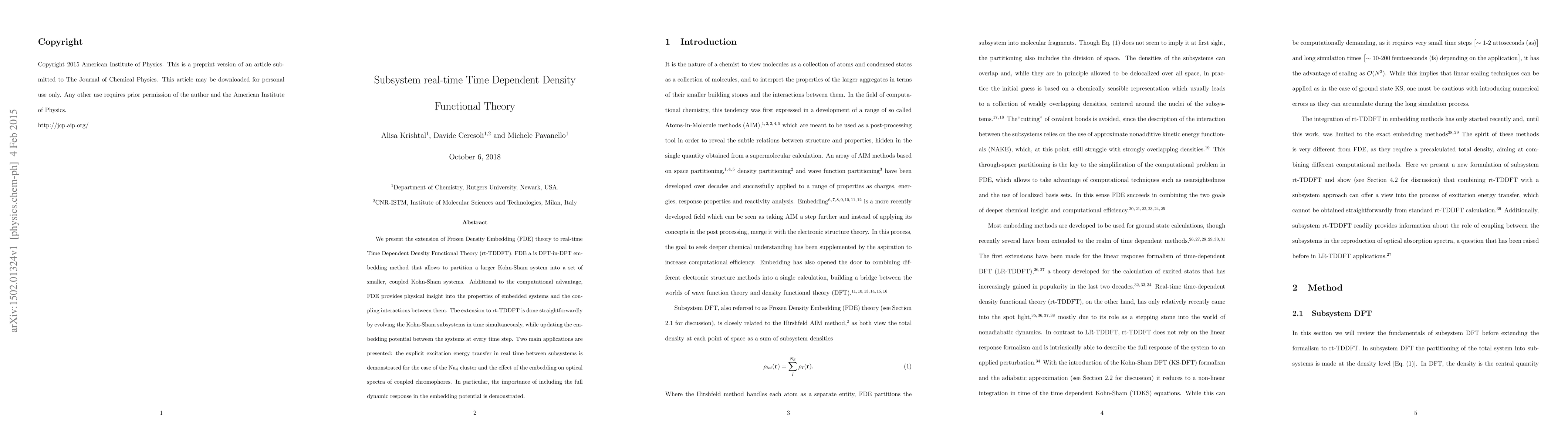 This paper extends Frozen Density Embedding (FDE) theory to real-time Time Dependent Density Functional Theory (rt-TDDFT), enabling the partitioning of larger Kohn-Sham systems into smaller subsystems. The method demonstrates real-time excitation energy transfer in Na$_4$ clusters and the impact of embedding on optical spectra of coupled chromophores, highlighting the necessity of full dynamic response in the embedding potential.