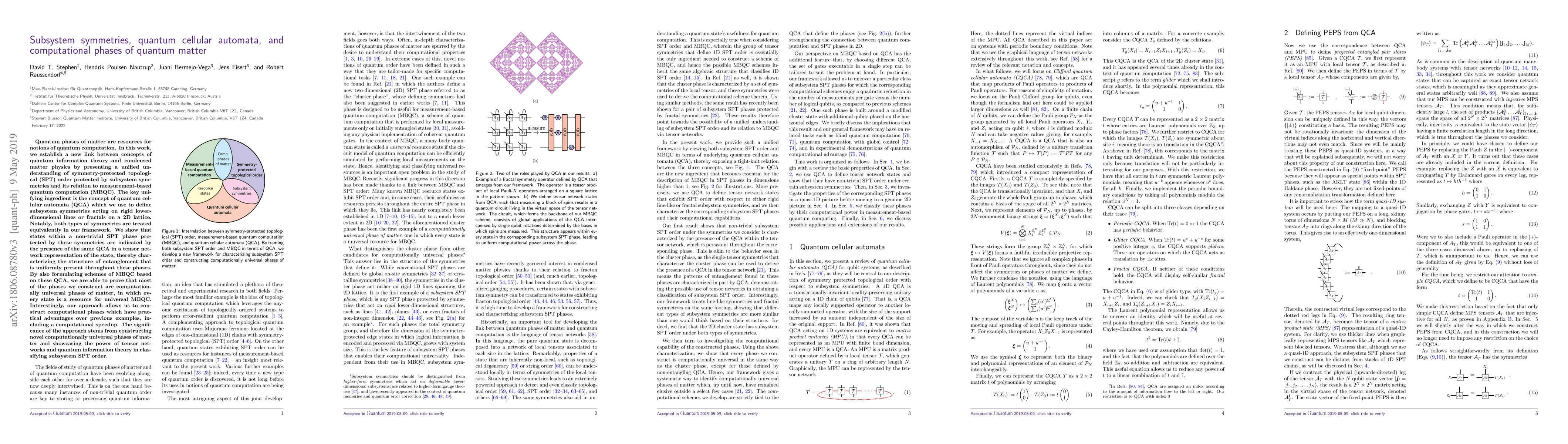 This paper explores the connection between quantum information theory and condensed matter physics, establishing a unified framework for symmetry-protected topological (SPT) order via quantum cellular automata (QCA). It demonstrates that SPT phases protected by subsystem symmetries can be characterized by QCA in tensor network representations, leading to computationally universal phases of matter with practical advantages.